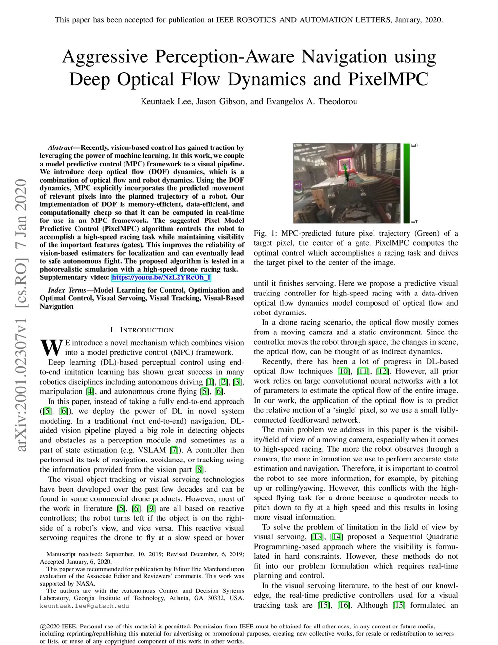 Recently, vision-based control has gained traction by leveraging the power of machine learning. In this work, we couple a model predictive control (MPC) framework to a visual pipeline. We introduce deep optical flow (DOF) dynamics, which is a combination of optical flow and robot dynamics. Using the DOF dynamics, MPC explicitly incorporates the predicted movement of relevant pixels into the planned trajectory of a robot. Our implementation of DOF is memory-efficient, data-efficient, and computationally cheap so that it can be computed in real-time for use in an MPC framework. The suggested Pixel Model Predictive Control (PixelMPC) algorithm controls the robot to accomplish a high-speed racing task while maintaining visibility of the important features (gates). This improves the reliability of vision-based estimators for localization and can eventually lead to safe autonomous flight. The proposed algorithm is tested in a photorealistic simulation with a high-speed drone racing task.