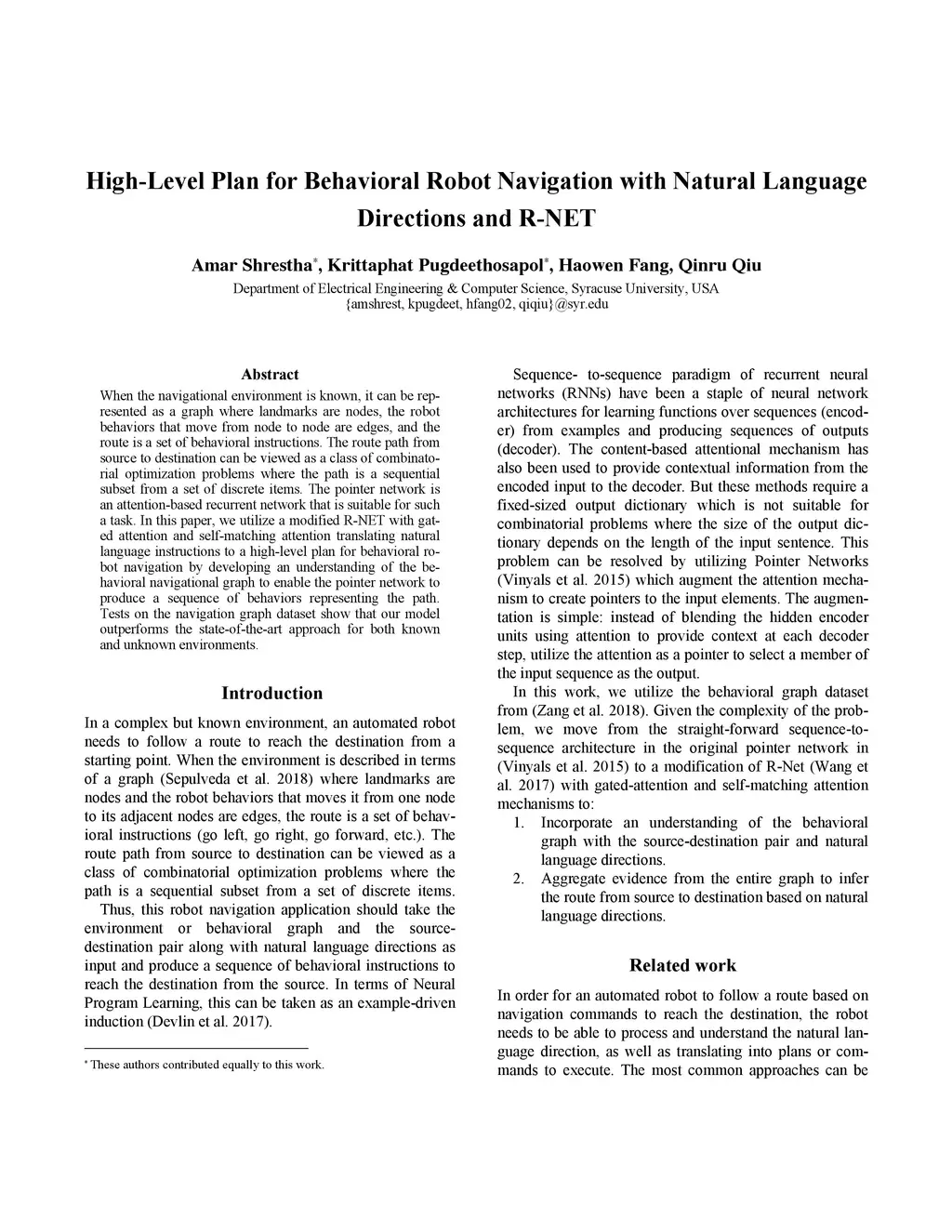 When the navigational environment is known, it can be represented as a graph where landmarks are nodes, the robot behaviors that move from node to node are edges, and the route is a set of behavioral instructions. The route path from source to destination can be viewed as a class of combinatorial optimization problems where the path is a sequential subset from a set of discrete items. The pointer network is an attention-based recurrent network that is suitable for such a task. In this paper, we utilize a modified R-NET with gated attention and self-matching attention translating natural language instructions to a high-level plan for behavioral robot navigation by developing an understanding of the behavioral navigational graph to enable the pointer network to produce a sequence of behaviors representing the path. Tests on the navigation graph dataset show that our model outperforms the state-of-the-art approach for both known and unknown environments.