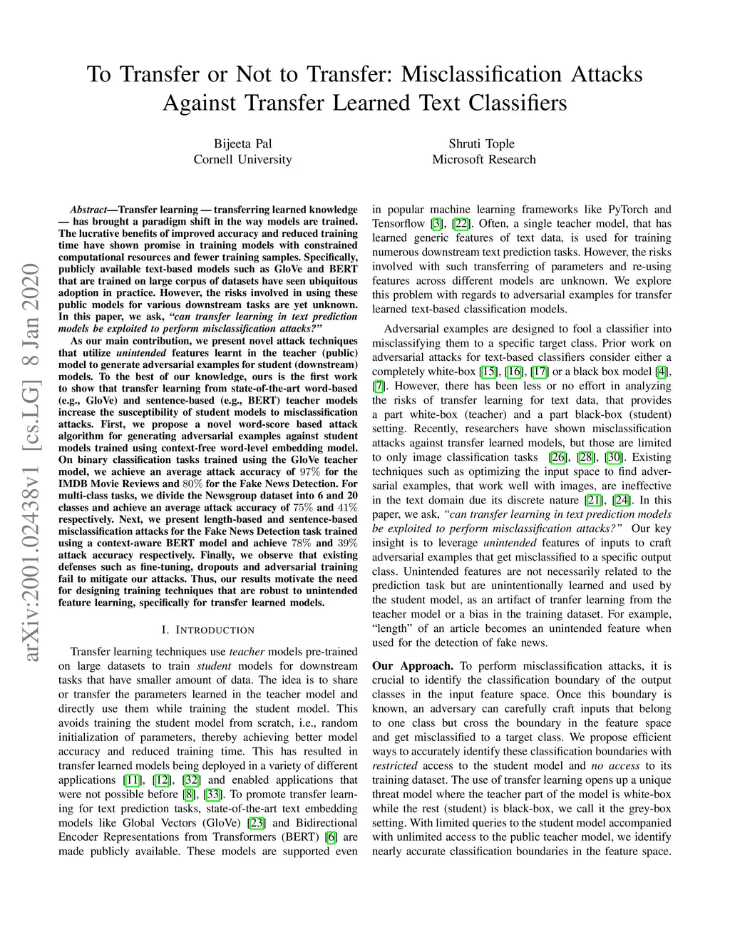 Transfer learning --- transferring learned knowledge --- has brought a paradigm shift in the way models are trained. The lucrative benefits of improved accuracy and reduced training time have shown promise in training models with constrained computational resources and fewer training samples. Specifically, publicly available text-based models such as GloVe and BERT that are trained on large corpus of datasets have seen ubiquitous adoption in practice. In this paper, we ask, "can transfer learning in text prediction models be exploited to perform misclassification attacks?" As our main contribution, we present novel attack techniques that utilize unintended features learnt in the teacher (public) model to generate adversarial examples for student (downstream) models. To the best of our knowledge, ours is the first work to show that transfer learning from state-of-the-art word-based and sentence-based teacher models increase the susceptibility of student models to misclassification attacks. First, we propose a novel word-score based attack algorithm for generating adversarial examples against student models trained using context-free word-level embedding model. On binary classification tasks trained using the GloVe teacher model, we achieve an average attack accuracy of 97% for the IMDB Movie Reviews and 80% for the Fake News Detection. For multi-class tasks, we divide the Newsgroup dataset into 6 and 20 classes and achieve an average attack accuracy of 75% and 41% respectively. Next, we present length-based and sentence-based misclassification attacks for the Fake News Detection task trained using a context-aware BERT model and achieve 78% and 39% attack accuracy respectively. Thus, our results motivate the need for designing training techniques that are robust to unintended feature learning, specifically for transfer learned models.