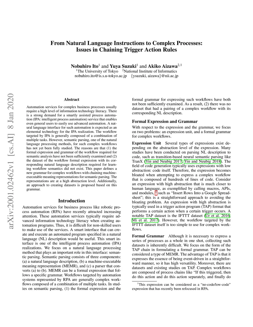 Automation services for complex business processes usually require a high level of information technology literacy. There is a strong demand for a smartly assisted process automation (IPA: intelligent process automation) service that enables even general users to easily use advanced automation. A natural language interface for such automation is expected as an elemental technology for the IPA realization. The workflow targeted by IPA is generally composed of a combination of multiple tasks. However, semantic parsing, one of the natural language processing methods, for such complex workflows has not yet been fully studied. The reasons are that (1) the formal expression and grammar of the workflow required for semantic analysis have not been sufficiently examined and (2) the dataset of the workflow formal expression with its corresponding natural language description required for learning workflow semantics did not exist. This paper defines a new grammar for complex workflows with chaining machine-executable meaning representations for semantic parsing. The representations are at a high abstraction level. Additionally, an approach to creating datasets is proposed based on this grammar.