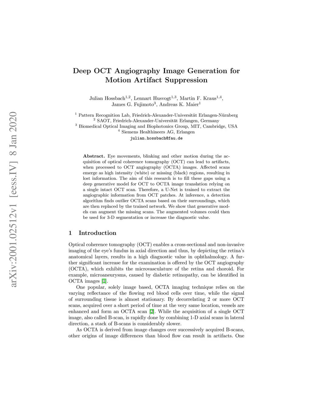 Eye movements, blinking and other motion during the acquisition of optical coherence tomography (OCT) can lead to artifacts, when processed to OCT angiography (OCTA) images. Affected scans emerge as high intensity (white) or missing (black) regions, resulting in lost information. The aim of this research is to fill these gaps using a deep generative model for OCT to OCTA image translation relying on a single intact OCT scan. Therefore, a U-Net is trained to extract the angiographic information from OCT patches. At inference, a detection algorithm finds outlier OCTA scans based on their surroundings, which are then replaced by the trained network. We show that generative models can augment the missing scans. The augmented volumes could then be used for 3-D segmentation or increase the diagnostic value.