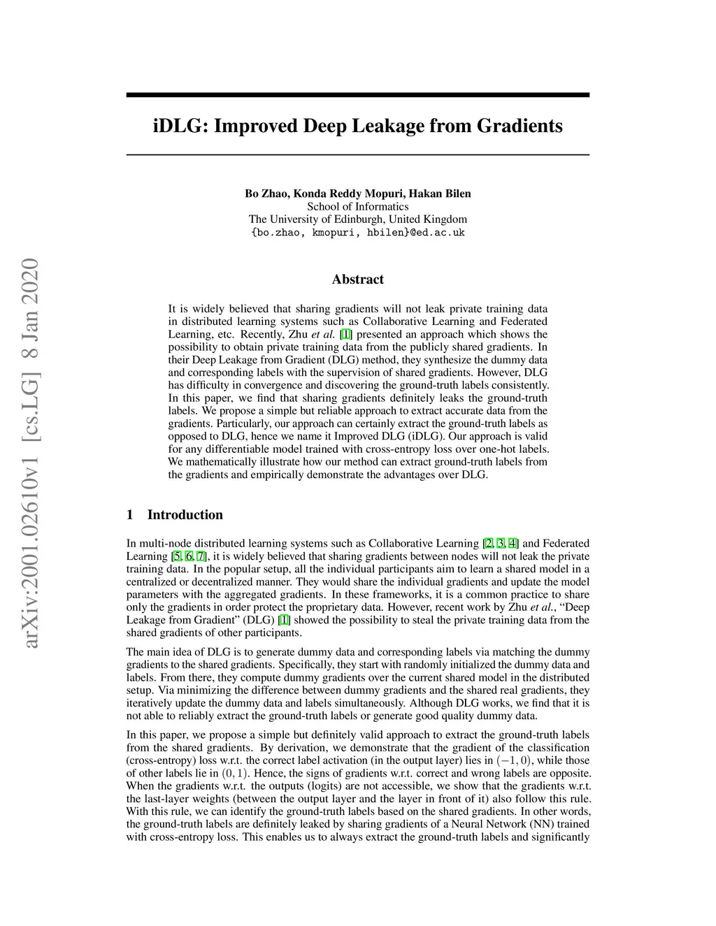 It is widely believed that sharing gradients will not leak private training data in distributed learning systems such as Collaborative Learning and Federated Learning, etc. Recently, Zhu et al. presented an approach which shows the possibility to obtain private training data from the publicly shared gradients. In their Deep Leakage from Gradient (DLG) method, they synthesize the dummy data and corresponding labels with the supervision of shared gradients. However, DLG has difficulty in convergence and discovering the ground-truth labels consistently. In this paper, we find that sharing gradients definitely leaks the ground-truth labels. We propose a simple but reliable approach to extract accurate data from the gradients. Particularly, our approach can certainly extract the ground-truth labels as opposed to DLG, hence we name it Improved DLG (iDLG). Our approach is valid for any differentiable model trained with cross-entropy loss over one-hot labels. We mathematically illustrate how our method can extract ground-truth labels from the gradients and empirically demonstrate the advantages over DLG.