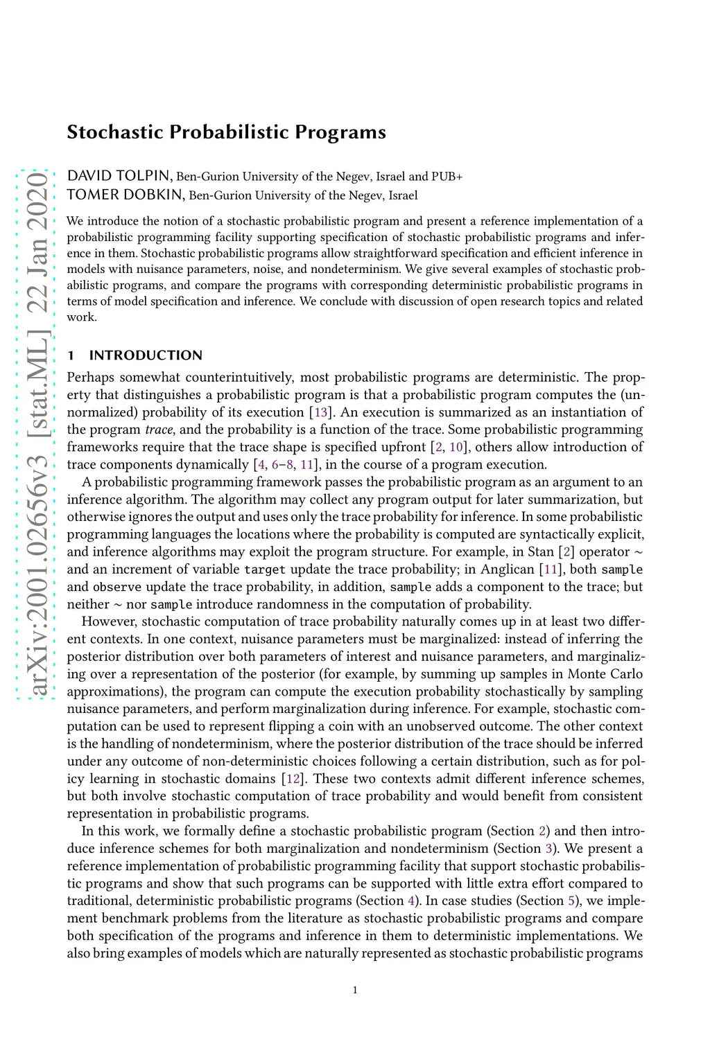 We introduce the notion of a stochastic probabilistic program and present a reference implementation of a probabilistic programming facility supporting specification of stochastic probabilistic programs and inference in them. Stochastic probabilistic programs allow straightforward specification and efficient inference in models with nuisance parameters, noise, and nondeterminism. We give several examples of stochastic probabilistic programs, and compare the programs with corresponding deterministic probabilistic programs in terms of model specification and inference. We conclude with discussion of open research topics and related work.