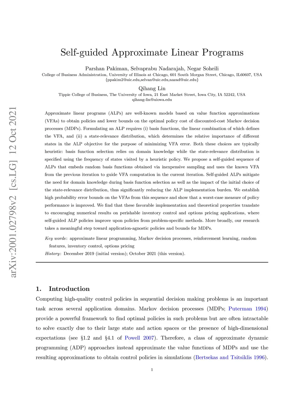 Approximate linear programs (ALPs) are well-known models based on value function approximations (VFAs) to obtain policies and lower bounds on the optimal policy cost of discounted-cost Markov decision processes (MDPs). Formulating an ALP requires (i) basis functions, the linear combination of which defines the VFA, and (ii) a state-relevance distribution, which determines the relative importance of different states in the ALP objective for the purpose of minimizing VFA error. Both these choices are typically heuristic: basis function selection relies on domain knowledge while the state-relevance distribution is specified using the frequency of states visited by a heuristic policy. We propose a self-guided sequence of ALPs that embeds random basis functions obtained via inexpensive sampling and uses the known VFA from the previous iteration to guide VFA computation in the current iteration. Self-guided ALPs mitigate the need for domain knowledge during basis function selection as well as the impact of the initial choice of the state-relevance distribution, thus significantly reducing the ALP implementation burden. We establish high probability error bounds on the VFAs from this sequence and show that a worst-case measure of policy performance is improved. We find that these favorable implementation and theoretical properties translate to encouraging numerical results on perishable inventory control and options pricing applications, where self-guided ALP policies improve upon policies from problem-specific methods. More broadly, our research takes a meaningful step toward application-agnostic policies and bounds for MDPs.