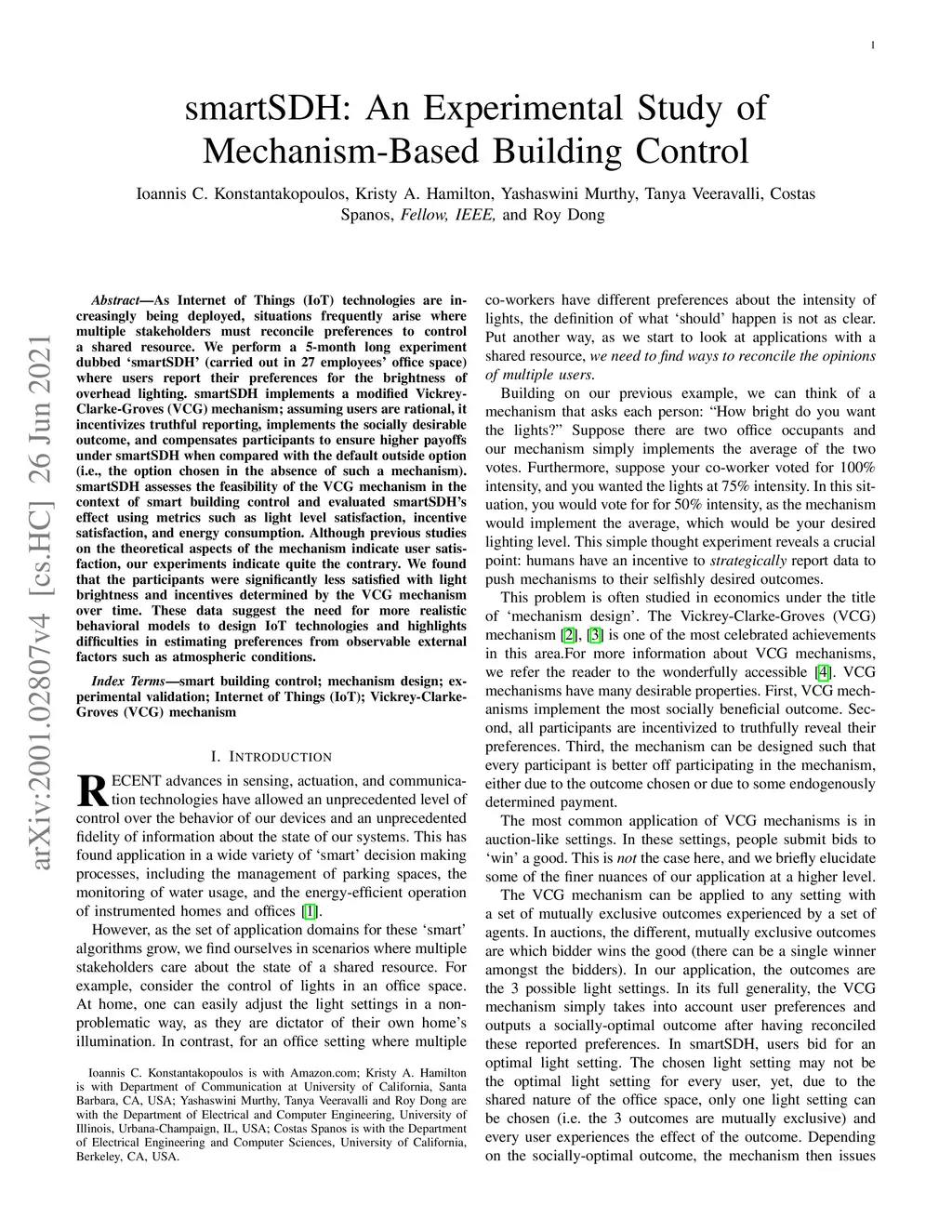 As Internet of Things (IoT) technologies are increasingly being deployed, situations frequently arise where multiple stakeholders must reconcile preferences to control a shared resource. We perform a 5-month long experiment dubbed 'smartSDH' (carried out in 27 employees' office space) where users report their preferences for the brightness of overhead lighting. smartSDH implements a modified Vickrey-Clarke-Groves (VCG) mechanism; assuming users are rational, it incentivizes truthful reporting, implements the socially desirable outcome, and compensates participants to ensure higher payoffs under smartSDH when compared with the default outside option(i.e., the option chosen in the absence of such a mechanism). smartSDH assesses the feasibility of the VCG mechanism in the context of smart building control and evaluated smartSDH's effect using metrics such as light level satisfaction, incentive satisfaction, and energy consumption. Although previous studies on the theoretical aspects of the mechanism indicate user satisfaction, our experiments indicate quite the contrary. We found that the participants were significantly less satisfied with light brightness and incentives determined by the VCG mechanism over time. These data suggest the need for more realistic behavioral models to design IoT technologies and highlights difficulties in estimating preferences from observable external factors such as atmospheric conditions.