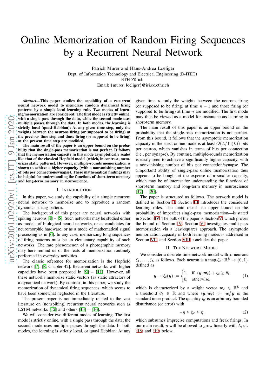 Online Memorization of Random Firing Sequences by a Recurrent Neural