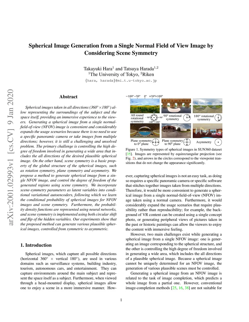 Spherical images taken in all directions (360 degrees) allow representing the surroundings of the subject and the space itself, providing an immersive experience to the viewers. Generating a spherical image from a single normal-field-of-view (NFOV) image is convenient and considerably expands the usage scenarios because there is no need to use a specific panoramic camera or take images from multiple directions; however, it is still a challenging and unsolved problem. The primary challenge is controlling the high degree of freedom involved in generating a wide area that includes the all directions of the desired plausible spherical image. On the other hand, scene symmetry is a basic property of the global structure of the spherical images, such as rotation symmetry, plane symmetry and asymmetry. We propose a method to generate spherical image from a single NFOV image, and control the degree of freedom of the generated regions using scene symmetry. We incorporate scene-symmetry parameters as latent variables into conditional variational autoencoders, following which we learn the conditional probability of spherical images for NFOV images and scene symmetry. Furthermore, the probability density functions are represented using neural networks, and scene symmetry is implemented using both circular shift and flip of the hidden variables. Our experiments show that the proposed method can generate various plausible spherical images, controlled from symmetric to asymmetric.
