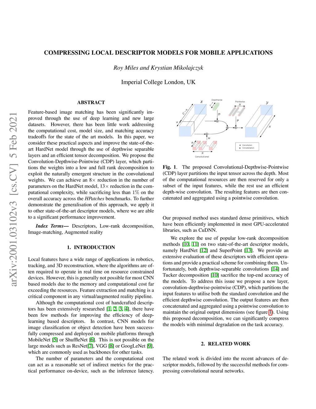 Deep neural networks have demonstrated state-of-the-art performance for feature-based image matching through the advent of new large and diverse datasets. However, there has been little work on evaluating the computational cost, model size, and matching accuracy tradeoffs for these models. This paper explicitly addresses these practical metrics by considering the state-of-the-art HardNet model. We observe a significant redundancy in the learned weights, which we exploit through the use of depthwise separable layers and an efficient Tucker decomposition. We demonstrate that a combination of these methods is very effective, but still sacrifices the top-end accuracy. To resolve this, we propose the Convolution-Depthwise-Pointwise(CDP) layer, which provides a means of interpolating between the standard and depthwise separable convolutions. With this proposed layer, we can achieve an 8 times reduction in the number of parameters on the HardNet model, 13 times reduction in the computational complexity, while sacrificing less than 1% on the overall accuracy across theHPatchesbenchmarks. To further demonstrate the generalisation of this approach, we apply it to the state-of-the-art SuperPoint model, where we can significantly reduce the number of parameters and floating-point operations, with minimal degradation in the matching accuracy.