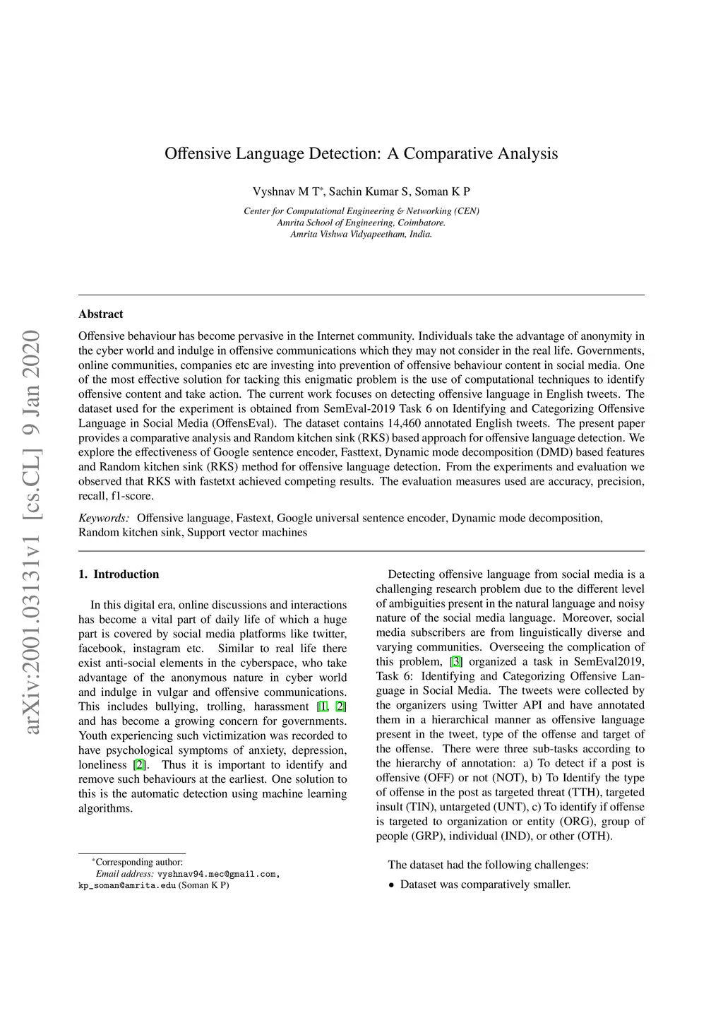 Offensive behaviour has become pervasive in the Internet community. Individuals take the advantage of anonymity in the cyber world and indulge in offensive communications which they may not consider in the real life. Governments, online communities, companies etc are investing into prevention of offensive behaviour content in social media. One of the most effective solution for tacking this enigmatic problem is the use of computational techniques to identify offensive content and take action. The current work focuses on detecting offensive language in English tweets. The dataset used for the experiment is obtained from SemEval-2019 Task 6 on Identifying and Categorizing Offensive Language in Social Media (OffensEval). The dataset contains 14,460 annotated English tweets. The present paper provides a comparative analysis and Random kitchen sink (RKS) based approach for offensive language detection. We explore the effectiveness of Google sentence encoder, Fasttext, Dynamic mode decomposition (DMD) based features and Random kitchen sink (RKS) method for offensive language detection. From the experiments and evaluation we observed that RKS with fastetxt achieved competing results. The evaluation measures used are accuracy, precision, recall, f1-score.