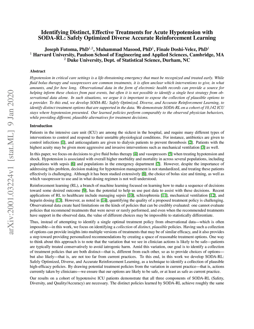 Hypotension in critical care settings is a life-threatening emergency that must be recognized and treated early. While fluid bolus therapy and vasopressors are common treatments, it is often unclear which interventions to give, in what amounts, and for how long. Observational data in the form of electronic health records can provide a source for helping inform these choices from past events, but often it is not possible to identify a single best strategy from observational data alone. In such situations, we argue it is important to expose the collection of plausible options to a provider. To this end, we develop SODA-RL: Safely Optimized, Diverse, and Accurate Reinforcement Learning, to identify distinct treatment options that are supported in the data. We demonstrate SODA-RL on a cohort of 10,142 ICU stays where hypotension presented. Our learned policies perform comparably to the observed physician behaviors, while providing different, plausible alternatives for treatment decisions.