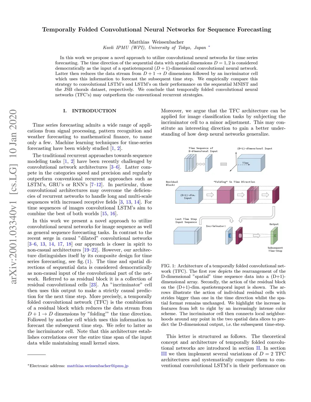 In this work we propose a novel approach to utilize convolutional neural networks for time series forecasting. The time direction of the sequential data with spatial dimensions is considered democratically as the input of a spatiotemporal -dimensional convolutional neural network. Latter then reduces the data stream from dimensions followed by an incriminator cell which uses this information to forecast the subsequent time step. We empirically compare this strategy to convolutional LSTM's and LSTM's on their performance on the sequential MNIST and the JSB chorals dataset, respectively. We conclude that temporally folded convolutional neural networks (TFC's) may outperform the conventional recurrent strategies.