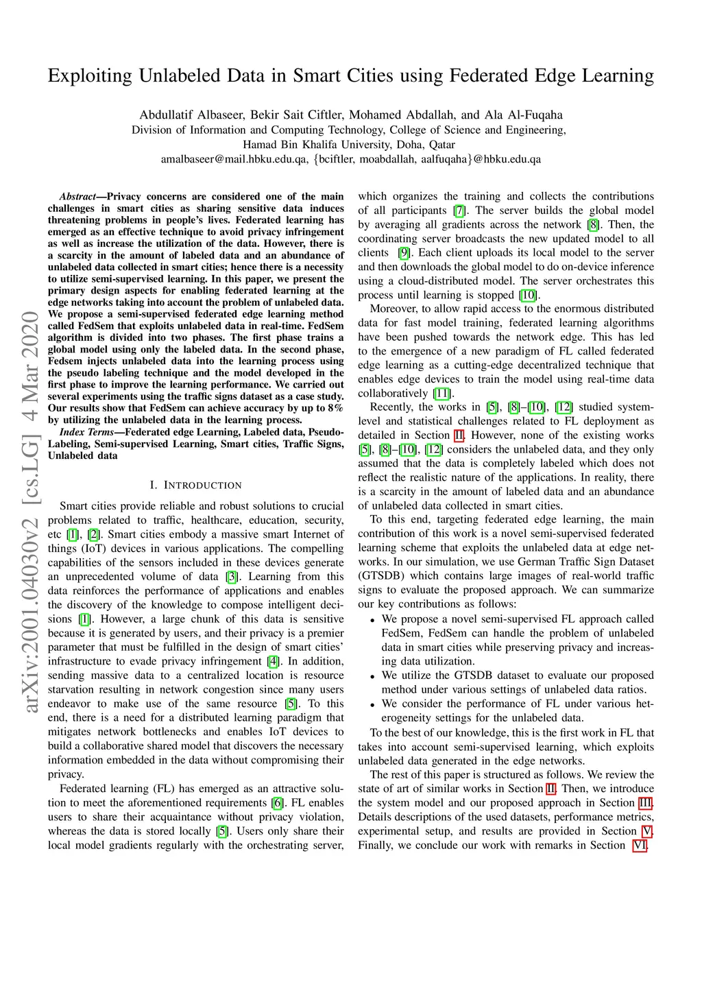 Privacy concerns are considered one of the main challenges in smart cities as sharing sensitive data brings threatening problems to people's lives. Federated learning has emerged as an effective technique to avoid privacy infringement as well as increase the utilization of the data. However, there is a scarcity in the amount of labeled data and an abundance of unlabeled data collected in smart cities, hence there is a need to use semi-supervised learning. We propose a semi-supervised federated learning method called FedSem that exploits unlabeled data. The algorithm is divided into two phases where the first phase trains a global model based on the labeled data. In the second phase, we use semi-supervised learning based on the pseudo labeling technique to improve the model. We conducted several experiments using traffic signs dataset to show that FedSem can improve accuracy up to 8% by utilizing the unlabeled data in the learning process.
