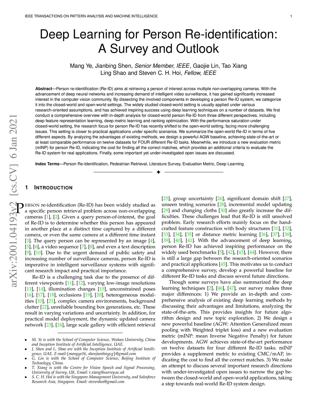 Person re-identification (Re-ID) aims at retrieving a person of interest across multiple non-overlapping cameras. With the advancement of deep neural networks and increasing demand of intelligent video surveillance, it has gained significantly increased interest in the computer vision community. By dissecting the involved components in developing a person Re-ID system, we categorize it into the closed-world and open-world settings. The widely studied closed-world setting is usually applied under various research-oriented assumptions, and has achieved inspiring success using deep learning techniques on a number of datasets. We first conduct a comprehensive overview with in-depth analysis for closed-world person Re-ID from three different perspectives, including deep feature representation learning, deep metric learning and ranking optimization. With the performance saturation under closed-world setting, the research focus for person Re-ID has recently shifted to the open-world setting, facing more challenging issues. This setting is closer to practical applications under specific scenarios. We summarize the open-world Re-ID in terms of five different aspects. By analyzing the advantages of existing methods, we design a powerful AGW baseline, achieving state-of-the-art or at least comparable performance on both single- and cross-modality Re-ID tasks. Meanwhile, we introduce a new evaluation metric (mINP) for person Re-ID, indicating the cost for finding all the correct matches, which provides an additional criteria to evaluate the Re-ID system for real applications. Finally, some important yet under-investigated open issues are discussed.