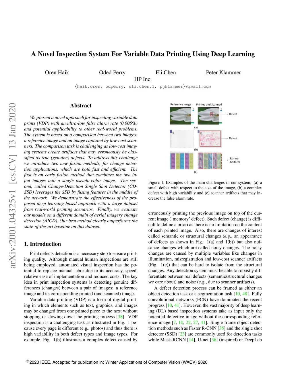 We present a novel approach for inspecting variable data prints (VDP) with an ultra-low false alarm rate (0.005%) and potential applicability to other real-world problems. The system is based on a comparison between two images: a reference image and an image captured by low-cost scanners. The comparison task is challenging as low-cost imaging systems create artifacts that may erroneously be classified as true (genuine) defects. To address this challenge we introduce two new fusion methods, for change detection applications, which are both fast and efficient. The first is an early fusion method that combines the two input images into a single pseudo-color image. The second, called Change-Detection Single Shot Detector (CD-SSD) leverages the SSD by fusing features in the middle of the network. We demonstrate the effectiveness of the proposed deep learning-based approach with a large dataset from real-world printing scenarios. Finally, we evaluate our models on a different domain of aerial imagery change detection (AICD). Our best method clearly outperforms the state-of-the-art baseline on this dataset.