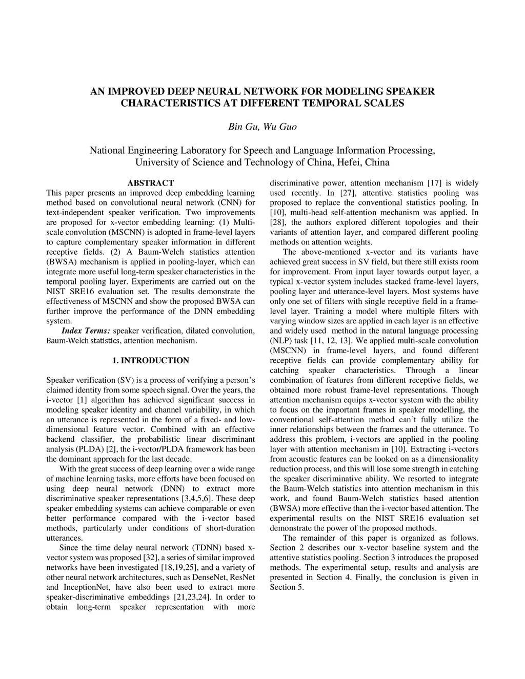 This paper presents an improved deep embedding learning method based on convolutional neural network (CNN) for text-independent speaker verification. Two improvements are proposed for x-vector embedding learning: (1) Multi-scale convolution (MSCNN) is adopted in frame-level layers to capture complementary speaker information in different receptive fields. (2) A Baum-Welch statistics attention (BWSA) mechanism is applied in pooling-layer, which can integrate more useful long-term speaker characteristics in the temporal pooling layer. Experiments are carried out on the NIST SRE16 evaluation set. The results demonstrate the effectiveness of MSCNN and show the proposed BWSA can further improve the performance of the DNN embedding system