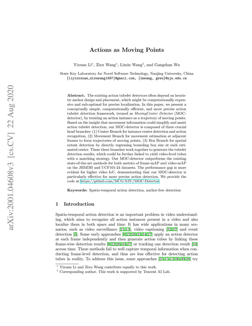 The existing action tubelet detectors often depend on heuristic anchor design and placement, which might be computationally expensive and sub-optimal for precise localization. In this paper, we present a conceptually simple, computationally efficient, and more precise action tubelet detection framework, termed as MovingCenter Detector (MOC-detector), by treating an action instance as a trajectory of moving points. Based on the insight that movement information could simplify and assist action tubelet detection, our MOC-detector is composed of three crucial head branches: (1) Center Branch for instance center detection and action recognition, (2) Movement Branch for movement estimation at adjacent frames to form trajectories of moving points, (3) Box Branch for spatial extent detection by directly regressing bounding box size at each estimated center. These three branches work together to generate the tubelet detection results, which could be further linked to yield video-level tubes with a matching strategy. Our MOC-detector outperforms the existing state-of-the-art methods for both metrics of frame-mAP and video-mAP on the JHMDB and UCF101-24 datasets. The performance gap is more evident for higher video IoU, demonstrating that our MOC-detector is particularly effective for more precise action detection. We provide the code at https://github.com/MCG-NJU/MOC-Detector.