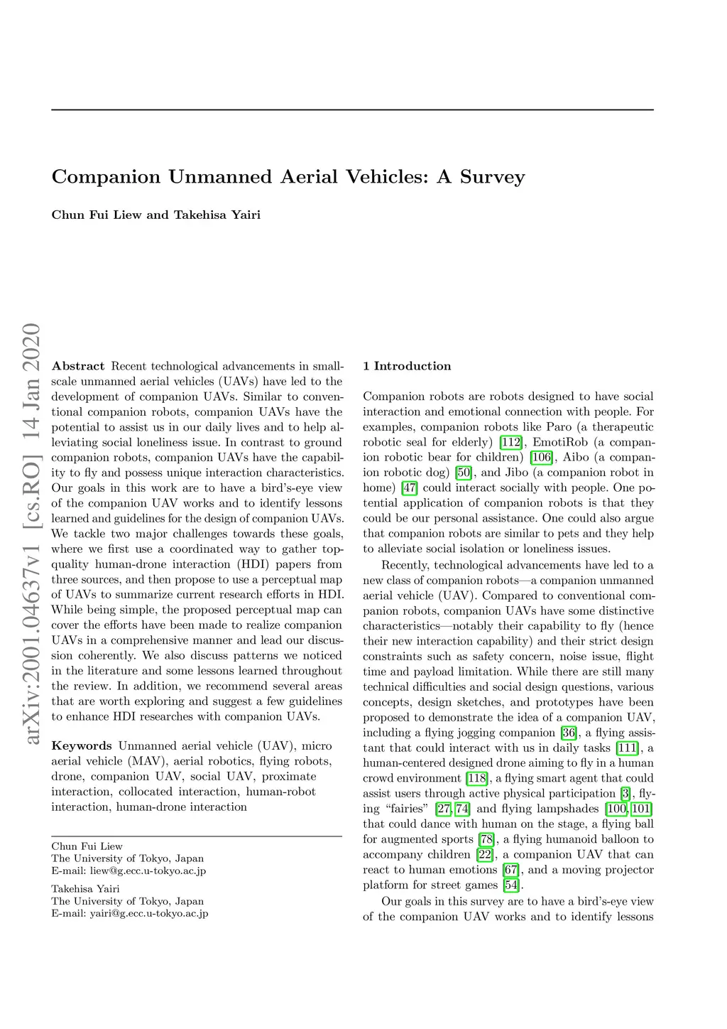 Recent technological advancements in small-scale unmanned aerial vehicles (UAVs) have led to the development of companion UAVs. Similar to conventional companion robots, companion UAVs have the potential to assist us in our daily lives and to help alleviating social loneliness issue. In contrast to ground companion robots, companion UAVs have the capability to fly and possess unique interaction characteristics. Our goals in this work are to have a bird's-eye view of the companion UAV works and to identify lessons learned and guidelines for the design of companion UAVs. We tackle two major challenges towards these goals, where we first use a coordinated way to gather top-quality human-drone interaction (HDI) papers from three sources, and then propose to use a perceptual map of UAVs to summarize current research efforts in HDI. While being simple, the proposed perceptual map can cover the efforts have been made to realize companion UAVs in a comprehensive manner and lead our discussion coherently. We also discuss patterns we noticed in the literature and some lessons learned throughout the review. In addition, we recommend several areas that are worth exploring and suggest a few guidelines to enhance HDI researches with companion UAVs.