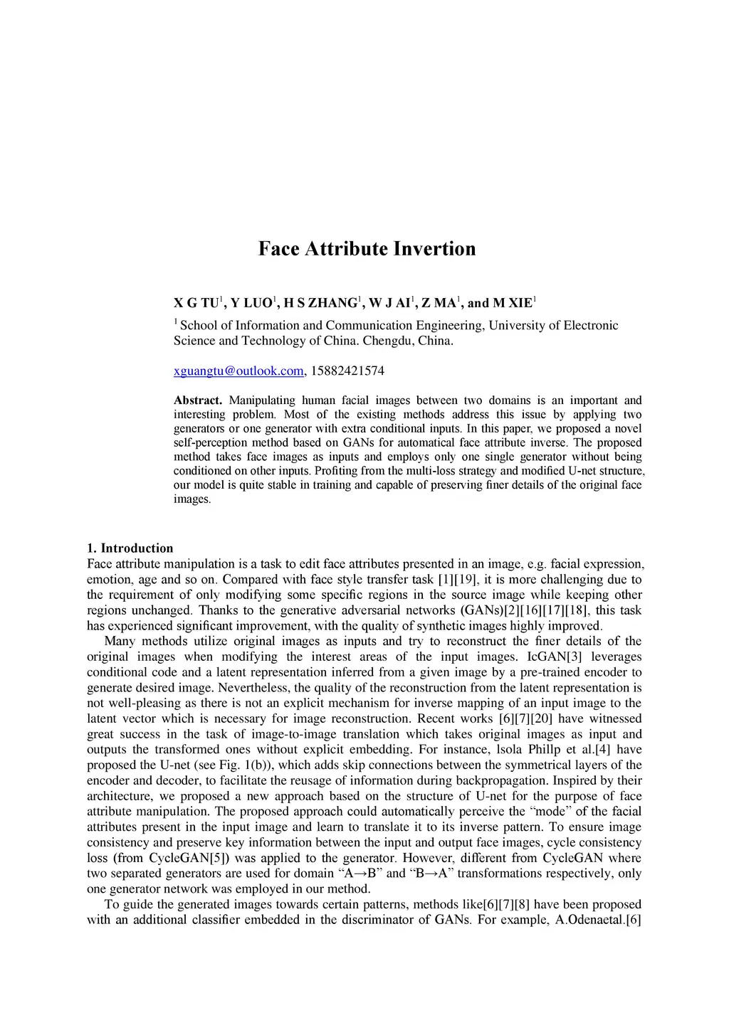 Manipulating human facial images between two domains is an important and interesting problem. Most of the existing methods address this issue by applying two generators or one generator with extra conditional inputs. In this paper, we proposed a novel self-perception method based on GANs for automatical face attribute inverse. The proposed method takes face images as inputs and employs only one single generator without being conditioned on other inputs. Profiting from the multi-loss strategy and modified U-net structure, our model is quite stable in training and capable of preserving finer details of the original face images.
