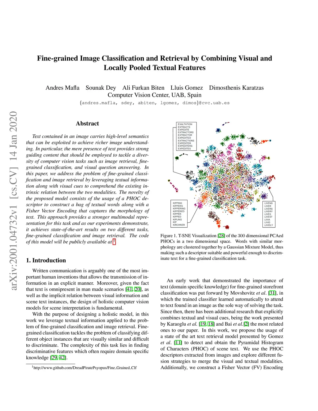 Text contained in an image carries high-level semantics that can be exploited to achieve richer image understanding. In particular, the mere presence of text provides strong guiding content that should be employed to tackle a diversity of computer vision tasks such as image retrieval, fine-grained classification, and visual question answering. In this paper, we address the problem of fine-grained classification and image retrieval by leveraging textual information along with visual cues to comprehend the existing intrinsic relation between the two modalities. The novelty of the proposed model consists of the usage of a PHOC descriptor to construct a bag of textual words along with a Fisher Vector Encoding that captures the morphology of text. This approach provides a stronger multimodal representation for this task and as our experiments demonstrate, it achieves state-of-the-art results on two different tasks, fine-grained classification and image retrieval.