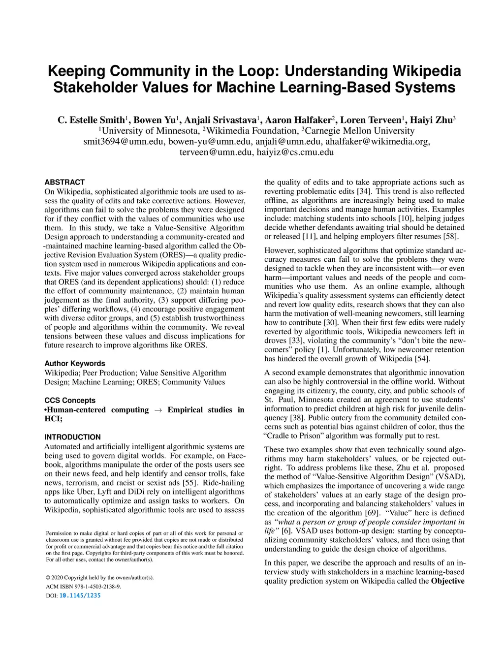 On Wikipedia, sophisticated algorithmic tools are used to assess the quality of edits and take corrective actions. However, algorithms can fail to solve the problems they were designed for if they conflict with the values of communities who use them. In this study, we take a Value-Sensitive Algorithm Design approach to understanding a community-created and -maintained machine learning-based algorithm called the Objective Revision Evaluation System (ORES)---a quality prediction system used in numerous Wikipedia applications and contexts. Five major values converged across stakeholder groups that ORES (and its dependent applications) should: (1) reduce the effort of community maintenance, (2) maintain human judgement as the final authority, (3) support differing peoples' differing workflows, (4) encourage positive engagement with diverse editor groups, and (5) establish trustworthiness of people and algorithms within the community. We reveal tensions between these values and discuss implications for future research to improve algorithms like ORES.