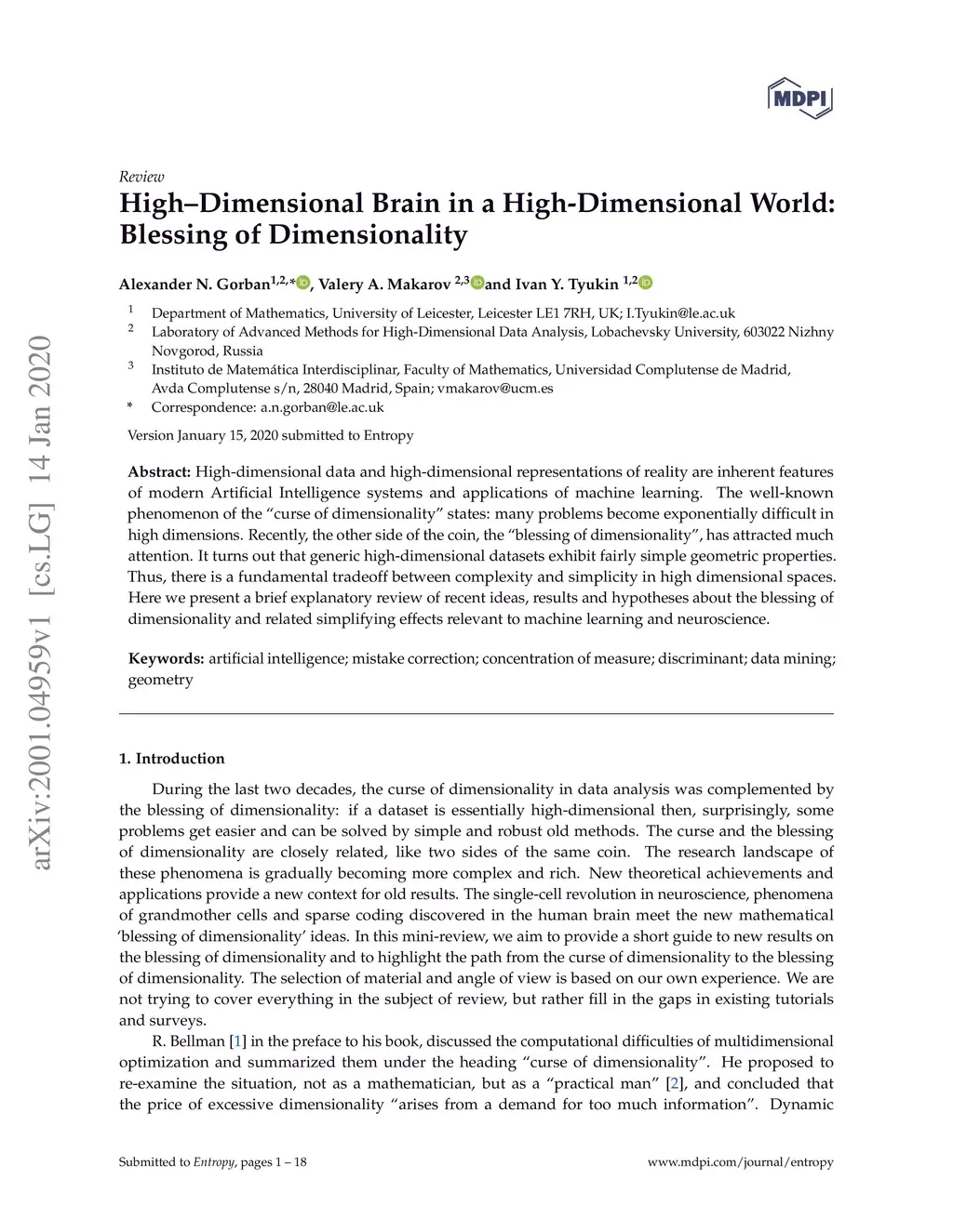 High-dimensional data and high-dimensional representations of reality are inherent features of modern Artificial Intelligence systems and applications of machine learning. The well-known phenomenon of the "curse of dimensionality" states: many problems become exponentially difficult in high dimensions. Recently, the other side of the coin, the "blessing of dimensionality", has attracted much attention. It turns out that generic high-dimensional datasets exhibit fairly simple geometric properties. Thus, there is a fundamental tradeoff between complexity and simplicity in high dimensional spaces. Here we present a brief explanatory review of recent ideas, results and hypotheses about the blessing of dimensionality and related simplifying effects relevant to machine learning and neuroscience.