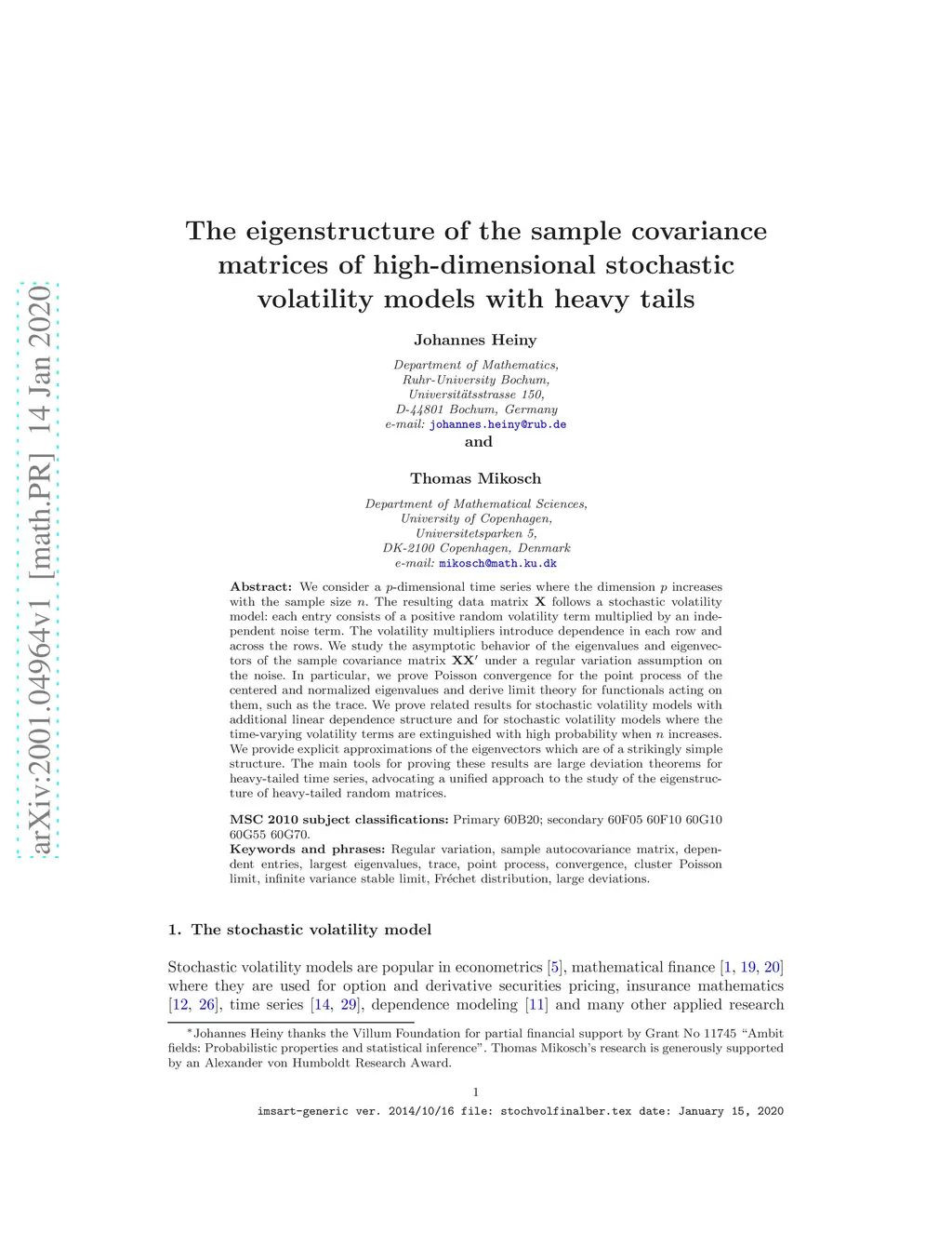 We consider a -dimensional time series where the dimension increases with the sample size . The resulting data matrix follows a stochastic volatility model: each entry consists of a positive random volatility term multiplied by an independent noise term. The volatility multipliers introduce dependence in each row and across the rows. We study the asymptotic behavior of the eigenvalues and eigenvectors of the sample covariance matrix under a regular variation assumption on the noise. In particular, we prove Poisson convergence for the point process of the centered and normalized eigenvalues and derive limit theory for functionals acting on them, such as the trace. We prove related results for stochastic volatility models with additional linear dependence structure and for stochastic volatility models where the time-varying volatility terms are extinguished with high probability when increases. We provide explicit approximations of the eigenvectors which are of a strikingly simple structure. The main tools for proving these results are large deviation theorems for heavy-tailed time series, advocating a unified approach to the study of the eigenstructure of heavy-tailed random matrices.