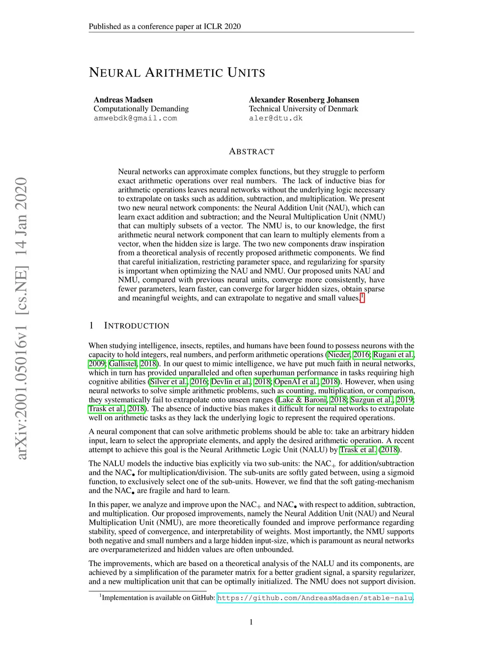 Neural networks can approximate complex functions, but they struggle to perform exact arithmetic operations over real numbers. The lack of inductive bias for arithmetic operations leaves neural networks without the underlying logic necessary to extrapolate on tasks such as addition, subtraction, and multiplication. We present two new neural network components: the Neural Addition Unit (NAU), which can learn exact addition and subtraction; and the Neural Multiplication Unit (NMU) that can multiply subsets of a vector. The NMU is, to our knowledge, the first arithmetic neural network component that can learn to multiply elements from a vector, when the hidden size is large. The two new components draw inspiration from a theoretical analysis of recently proposed arithmetic components. We find that careful initialization, restricting parameter space, and regularizing for sparsity is important when optimizing the NAU and NMU. Our proposed units NAU and NMU, compared with previous neural units, converge more consistently, have fewer parameters, learn faster, can converge for larger hidden sizes, obtain sparse and meaningful weights, and can extrapolate to negative and small values.