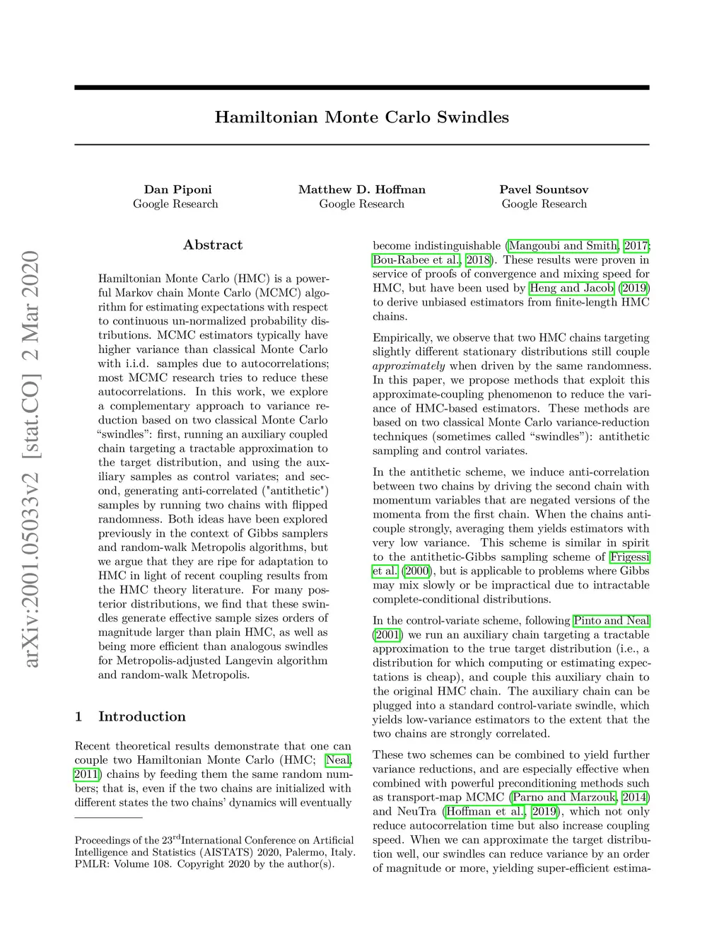 Hamiltonian Monte Carlo (HMC) is a powerful Markov chain Monte Carlo (MCMC) algorithm for estimating expectations with respect to continuous un-normalized probability distributions. MCMC estimators typically have higher variance than classical Monte Carlo with i.i.d. samples due to autocorrelations; most MCMC research tries to reduce these autocorrelations. In this work, we explore a complementary approach to variance reduction based on two classical Monte Carlo "swindles": first, running an auxiliary coupled chain targeting a tractable approximation to the target distribution, and using the auxiliary samples as control variates; and second, generating anti-correlated ("antithetic") samples by running two chains with flipped randomness. Both ideas have been explored previously in the context of Gibbs samplers and random-walk Metropolis algorithms, but we argue that they are ripe for adaptation to HMC in light of recent coupling results from the HMC theory literature. For many posterior distributions, we find that these swindles generate effective sample sizes orders of magnitude larger than plain HMC, as well as being more efficient than analogous swindles for Metropolis-adjusted Langevin algorithm and random-walk Metropolis.