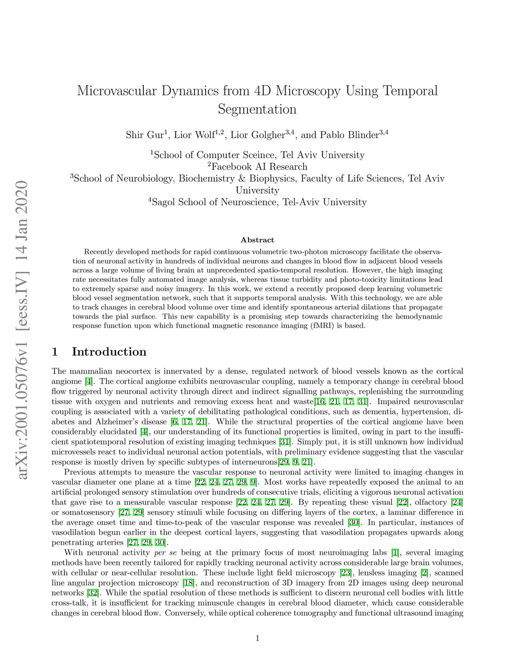 Recently developed methods for rapid continuous volumetric two-photon microscopy facilitate the observation of neuronal activity in hundreds of individual neurons and changes in blood flow in adjacent blood vessels across a large volume of living brain at unprecedented spatio-temporal resolution. However, the high imaging rate necessitates fully automated image analysis, whereas tissue turbidity and photo-toxicity limitations lead to extremely sparse and noisy imagery. In this work, we extend a recently proposed deep learning volumetric blood vessel segmentation network, such that it supports temporal analysis. With this technology, we are able to track changes in cerebral blood volume over time and identify spontaneous arterial dilations that propagate towards the pial surface. This new capability is a promising step towards characterizing the hemodynamic response function upon which functional magnetic resonance imaging (fMRI) is based.