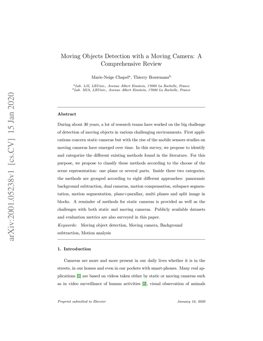 During about 30 years, a lot of research teams have worked on the big challenge of detection of moving objects in various challenging environments. First applications concern static cameras but with the rise of the mobile sensors studies on moving cameras have emerged over time. In this survey, we propose to identify and categorize the different existing methods found in the literature. For this purpose, we propose to classify these methods according to the choose of the scene representation: one plane or several parts. Inside these two categories, the methods are grouped according to eight different approaches: panoramic background subtraction, dual cameras, motion compensation, subspace segmentation, motion segmentation, plane+parallax, multi planes and split image in blocks. A reminder of methods for static cameras is provided as well as the challenges with both static and moving cameras. Publicly available datasets and evaluation metrics are also surveyed in this paper.