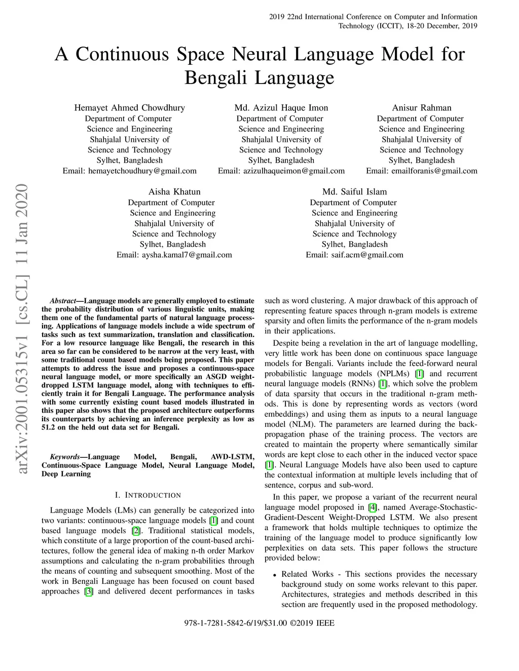 Language models are generally employed to estimate the probability distribution of various linguistic units, making them one of the fundamental parts of natural language processing. Applications of language models include a wide spectrum of tasks such as text summarization, translation and classification. For a low resource language like Bengali, the research in this area so far can be considered to be narrow at the very least, with some traditional count based models being proposed. This paper attempts to address the issue and proposes a continuous-space neural language model, or more specifically an ASGD weight dropped LSTM language model, along with techniques to efficiently train it for Bengali Language. The performance analysis with some currently existing count based models illustrated in this paper also shows that the proposed architecture outperforms its counterparts by achieving an inference perplexity as low as 51.2 on the held out data set for Bengali.