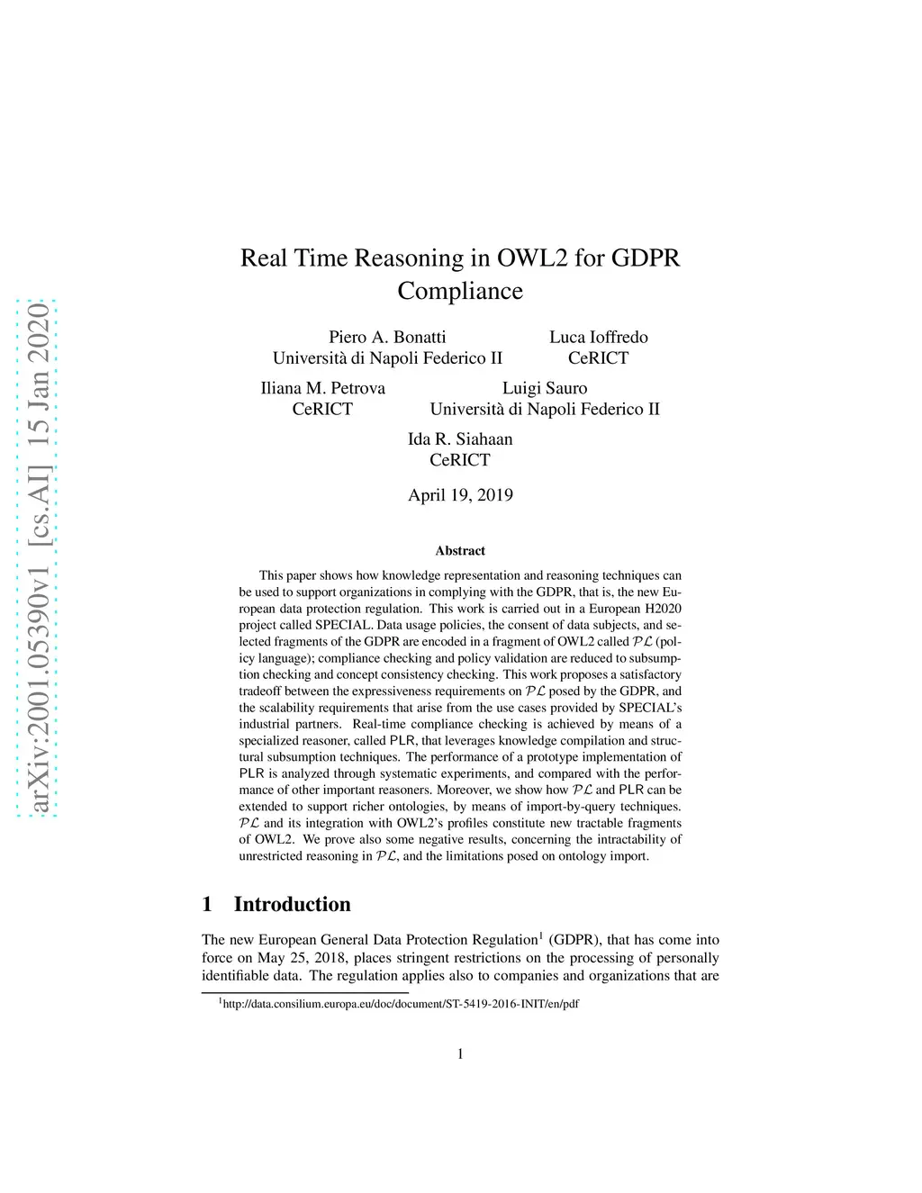 This paper shows how knowledge representation and reasoning techniques can be used to support organizations in complying with the GDPR, that is, the new European data protection regulation. This work is carried out in a European H2020 project called SPECIAL. Data usage policies, the consent of data subjects, and selected fragments of the GDPR are encoded in a fragment of OWL2 called PL (policy language); compliance checking and policy validation are reduced to subsumption checking and concept consistency checking. This work proposes a satisfactory tradeoff between the expressiveness requirements on PL posed by the GDPR, and the scalability requirements that arise from the use cases provided by SPECIAL's industrial partners. Real-time compliance checking is achieved by means of a specialized reasoner, called PLR, that leverages knowledge compilation and structural subsumption techniques. The performance of a prototype implementation of PLR is analyzed through systematic experiments, and compared with the performance of other important reasoners. Moreover, we show how PL and PLR can be extended to support richer ontologies, by means of import-by-query techniques. PL and its integration with OWL2's profiles constitute new tractable fragments of OWL2. We prove also some negative results, concerning the intractability of unrestricted reasoning in PL, and the limitations posed on ontology import.