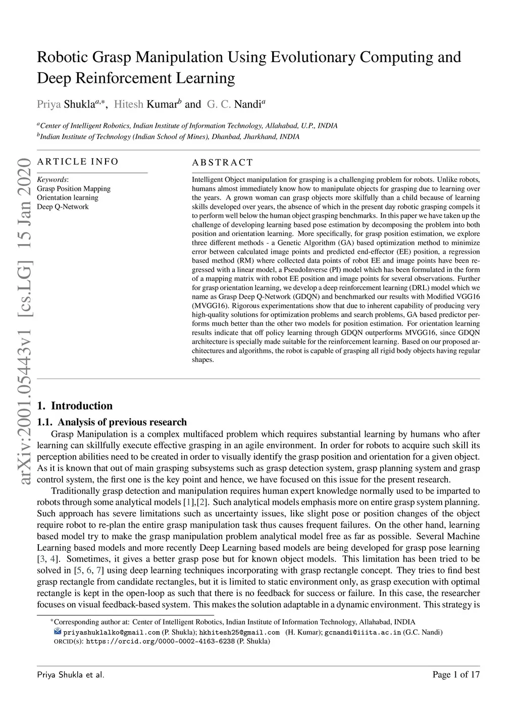 Robotic Grasp Manipulation Using Evolutionary Computing and Deep
