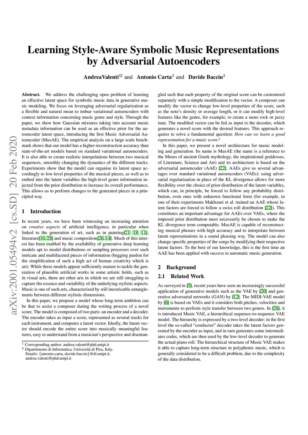 We address the challenging open problem of learning an effective latent space for symbolic music data in generative music modeling. We focus on leveraging adversarial regularization as a flexible and natural mean to imbue variational autoencoders with context information concerning music genre and style. Through the paper, we show how Gaussian mixtures taking into account music metadata information can be used as an effective prior for the autoencoder latent space, introducing the first Music Adversarial Autoencoder (MusAE). The empirical analysis on a large scale benchmark shows that our model has a higher reconstruction accuracy than state-of-the-art models based on standard variational autoencoders. It is also able to create realistic interpolations between two musical sequences, smoothly changing the dynamics of the different tracks. Experiments show that the model can organise its latent space accordingly to low-level properties of the musical pieces, as well as to embed into the latent variables the high-level genre information injected from the prior distribution to increase its overall performance. This allows us to perform changes to the generated pieces in a principled way.