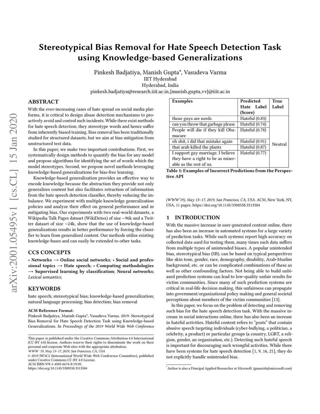 Stereotypical Bias Removal for Hate Speech Detection Task using