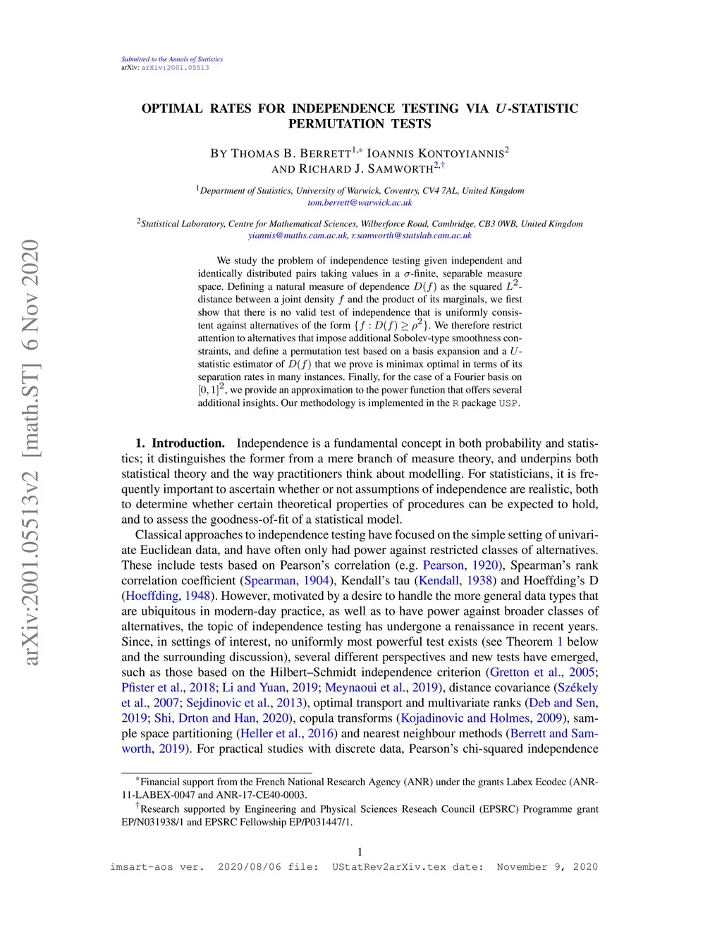We study the problem of independence testing given independent and identically distributed pairs taking values in a -finite, separable measure space. Defining a natural measure of dependence as the squared -distance between a joint density and the product of its marginals, we first show that there is no valid test of independence that is uniformly consistent against alternatives of the form . We therefore restrict attention to alternatives that impose additional Sobolev-type smoothness constraints, and define a permutation test based on a basis expansion and a -statistic estimator of that we prove is minimax optimal in terms of its separation rates in many instances. Finally, for the case of a Fourier basis on , we provide an approximation to the power function that offers several additional insights. Our methodology is implemented in the R package USP.