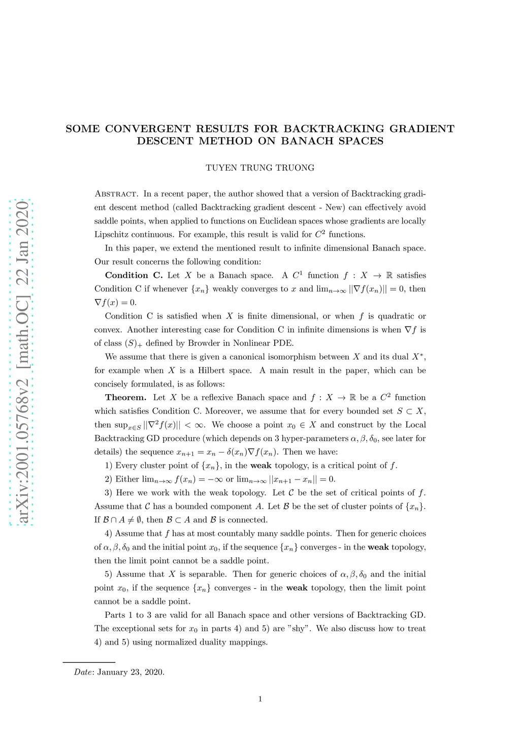 Our main result concerns the following condition: {\bf Condition C.} Let be a Banach space. A function satisfies Condition C if whenever weakly converges to and , then . We assume that there is given a canonical isomorphism between and its dual , for example when is a Hilbert space. {\bf Theorem.} Let be a reflexive, complete Banach space and be a function which satisfies Condition C. Moreover, we assume that for every bounded set , then . We choose a random point and construct by the Local Backtracking GD procedure (which depends on hyper-parameters , see later for details) the sequence . Then we have: 1) Every cluster point of , in the {\bf weak} topology, is a critical point of . 2) Either or . 3) Here we work with the weak topology. Let be the set of critical points of . Assume that has a bounded component . Let be the set of cluster points of . If , then and is connected. 4) Assume that is separable. Then for generic choices of and the initial point , if the sequence converges - in the {\bf weak} topology, then the limit point cannot be a saddle point.