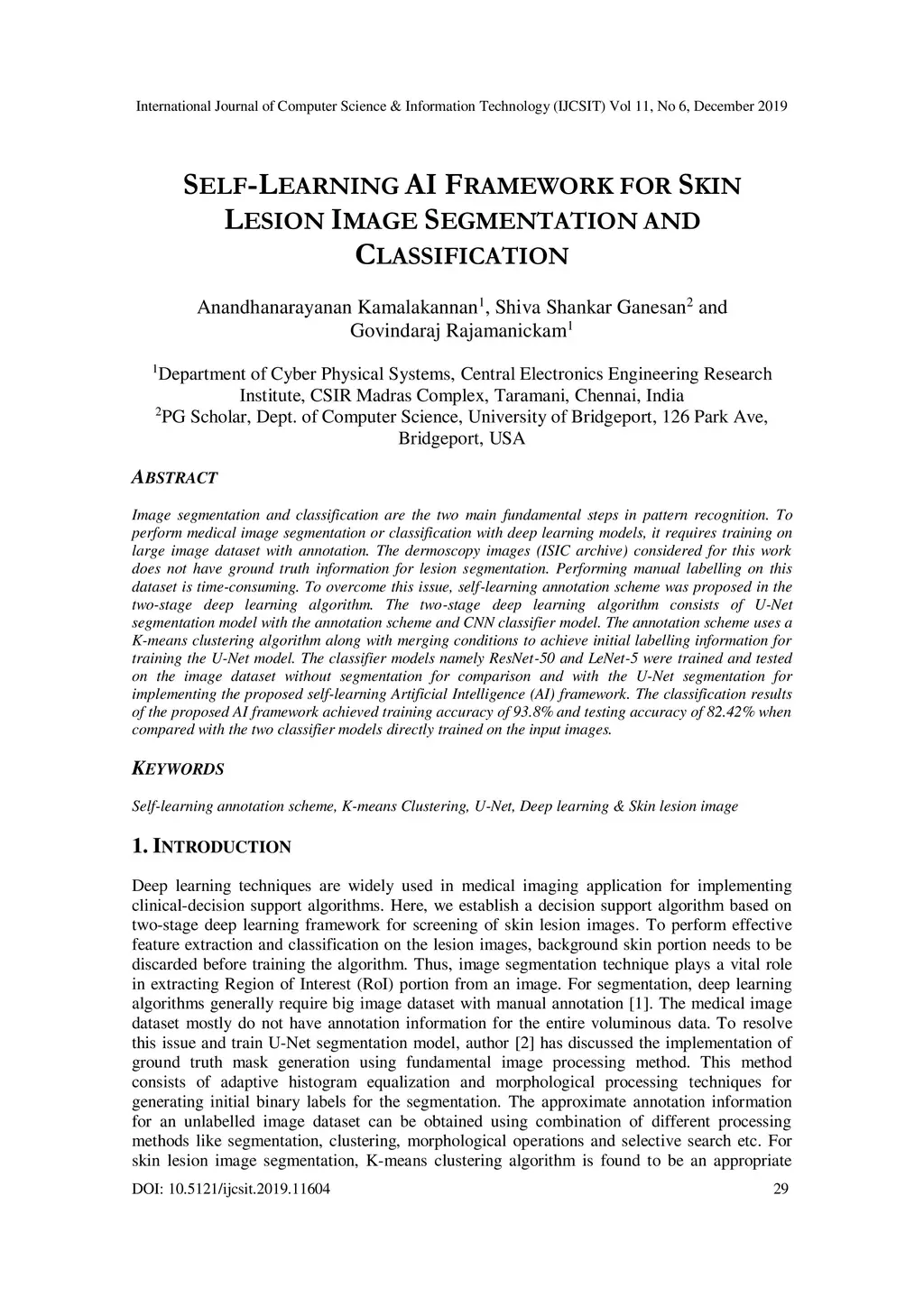 Image segmentation and classification are the two main fundamental steps in pattern recognition. To perform medical image segmentation or classification with deep learning models, it requires training on large image dataset with annotation. The dermoscopy images (ISIC archive) considered for this work does not have ground truth information for lesion segmentation. Performing manual labelling on this dataset is time-consuming. To overcome this issue, self-learning annotation scheme was proposed in the two-stage deep learning algorithm. The two-stage deep learning algorithm consists of U-Net segmentation model with the annotation scheme and CNN classifier model. The annotation scheme uses a K-means clustering algorithm along with merging conditions to achieve initial labelling information for training the U-Net model. The classifier models namely ResNet-50 and LeNet-5 were trained and tested on the image dataset without segmentation for comparison and with the U-Net segmentation for implementing the proposed self-learning Artificial Intelligence (AI) framework. The classification results of the proposed AI framework achieved training accuracy of 93.8% and testing accuracy of 82.42% when compared with the two classifier models directly trained on the input images.