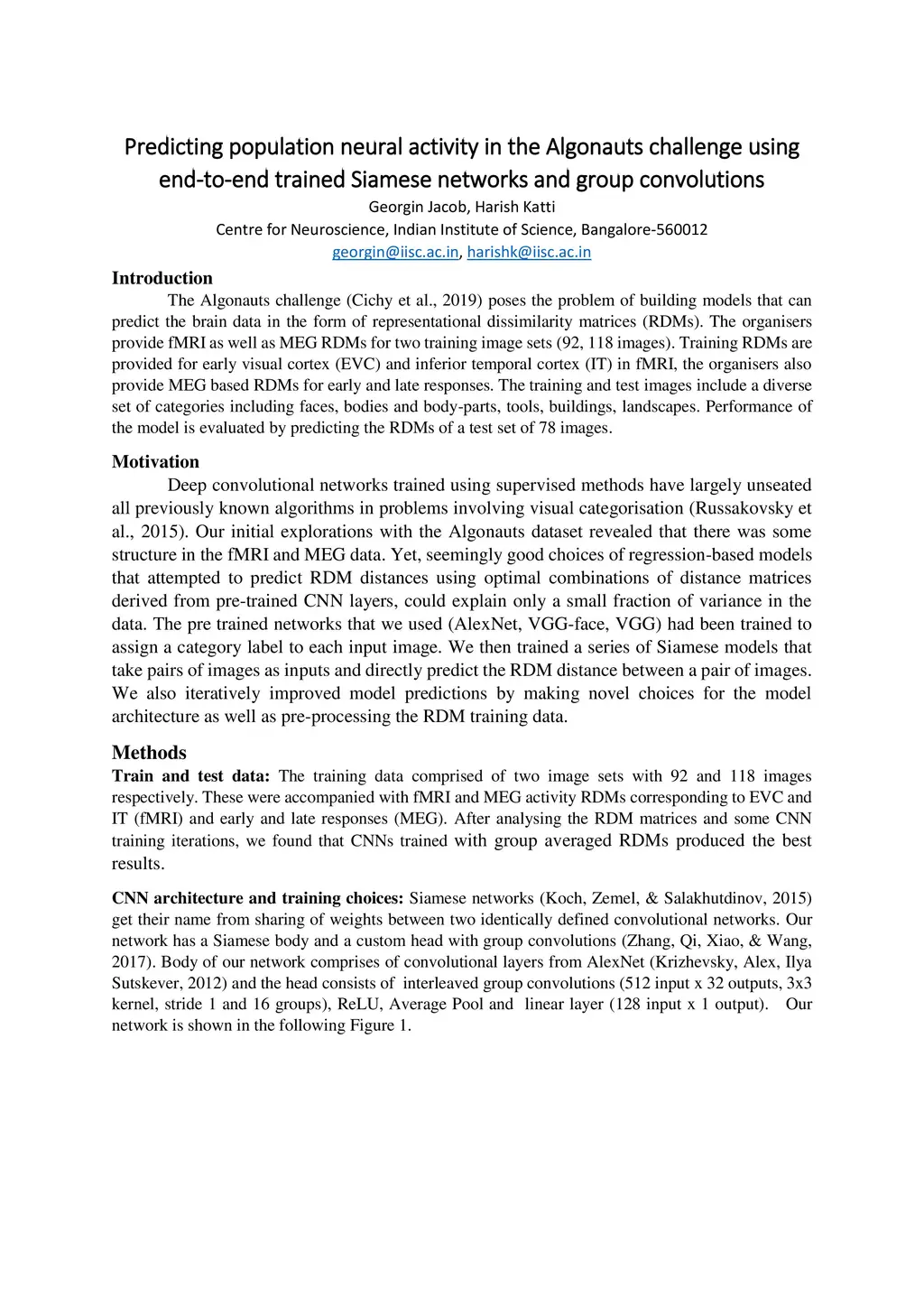 The Algonauts challenge is about predicting the object representations in the form of Representational Dissimilarity Matrices (RDMS) derived from visual brain regions. We used a customized deep learning model using the concept of Siamese networks and group convolutions to predict neural distances corresponding to a pair of images. Training data was best explained by distances computed over the last layer.