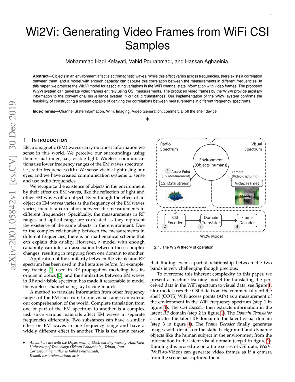 Objects in an environment affect electromagnetic waves. While this effect varies across frequencies, there exists a correlation between them, and a model with enough capacity can capture this correlation between the measurements in different frequencies. In this paper, we propose the Wi2Vi model for associating variations in the WiFi channel state information with video frames. The proposed Wi2Vi system can generate video frames entirely using CSI measurements. The produced video frames by the Wi2Vi provide auxiliary information to the conventional surveillance system in critical circumstances. Our implementation of the Wi2Vi system confirms the feasibility of constructing a system capable of deriving the correlations between measurements in different frequency spectrums.