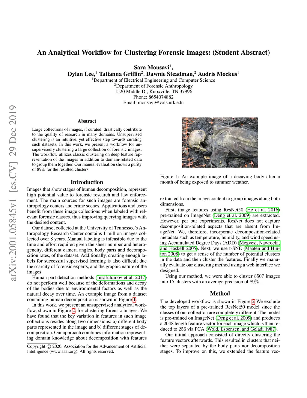 Large collections of images, if curated, drastically contribute to the quality of research in many domains. Unsupervised clustering is an intuitive, yet effective step towards curating such datasets. In this work, we present a workflow for unsupervisedly clustering a large collection of forensic images. The workflow utilizes classic clustering on deep feature representation of the images in addition to domain-related data to group them together. Our manual evaluation shows a purity of 89\% for the resulted clusters.