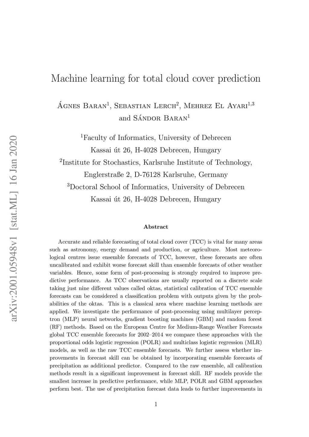 Machine learning for total cloud cover prediction