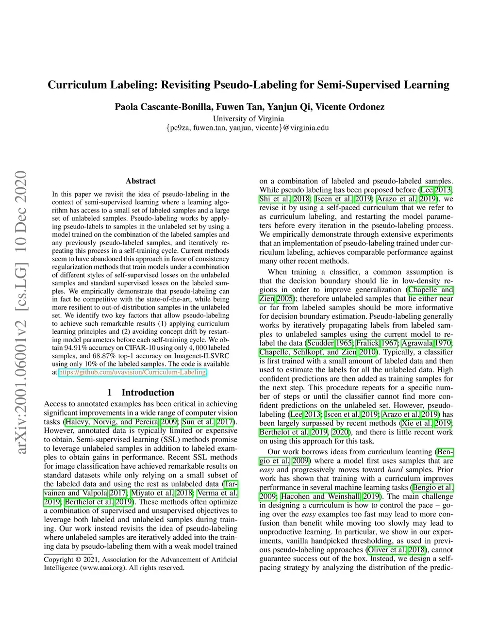 In this paper we revisit the idea of pseudo-labeling in the context of semi-supervised learning where a learning algorithm has access to a small set of labeled samples and a large set of unlabeled samples. Pseudo-labeling works by applying pseudo-labels to samples in the unlabeled set by using a model trained on the combination of the labeled samples and any previously pseudo-labeled samples, and iteratively repeating this process in a self-training cycle. Current methods seem to have abandoned this approach in favor of consistency regularization methods that train models under a combination of different styles of self-supervised losses on the unlabeled samples and standard supervised losses on the labeled samples. We empirically demonstrate that pseudo-labeling can in fact be competitive with the state-of-the-art, while being more resilient to out-of-distribution samples in the unlabeled set. We identify two key factors that allow pseudo-labeling to achieve such remarkable results (1) applying curriculum learning principles and (2) avoiding concept drift by restarting model parameters before each self-training cycle. We obtain 94.91% accuracy on CIFAR-10 using only 4,000 labeled samples, and 68.87% top-1 accuracy on Imagenet-ILSVRC using only 10% of the labeled samples. The code is available at https://github.com/uvavision/Curriculum-Labeling