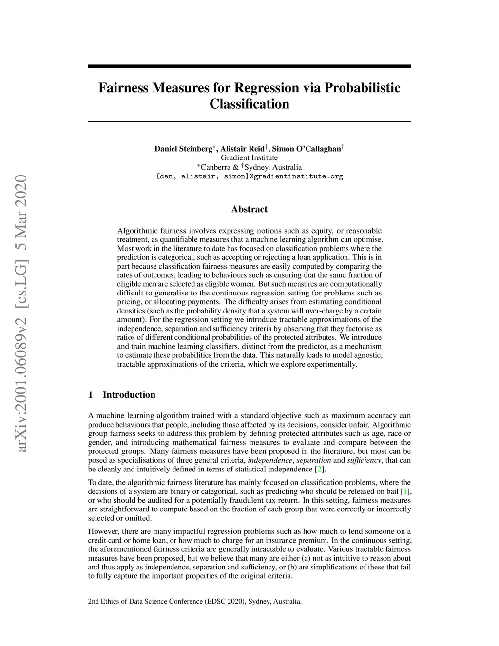 Algorithmic fairness involves expressing notions such as equity, or reasonable treatment, as quantifiable measures that a machine learning algorithm can optimise. Most work in the literature to date has focused on classification problems where the prediction is categorical, such as accepting or rejecting a loan application. This is in part because classification fairness measures are easily computed by comparing the rates of outcomes, leading to behaviours such as ensuring that the same fraction of eligible men are selected as eligible women. But such measures are computationally difficult to generalise to the continuous regression setting for problems such as pricing, or allocating payments. The difficulty arises from estimating conditional densities (such as the probability density that a system will over-charge by a certain amount). For the regression setting we introduce tractable approximations of the independence, separation and sufficiency criteria by observing that they factorise as ratios of different conditional probabilities of the protected attributes. We introduce and train machine learning classifiers, distinct from the predictor, as a mechanism to estimate these probabilities from the data. This naturally leads to model agnostic, tractable approximations of the criteria, which we explore experimentally.