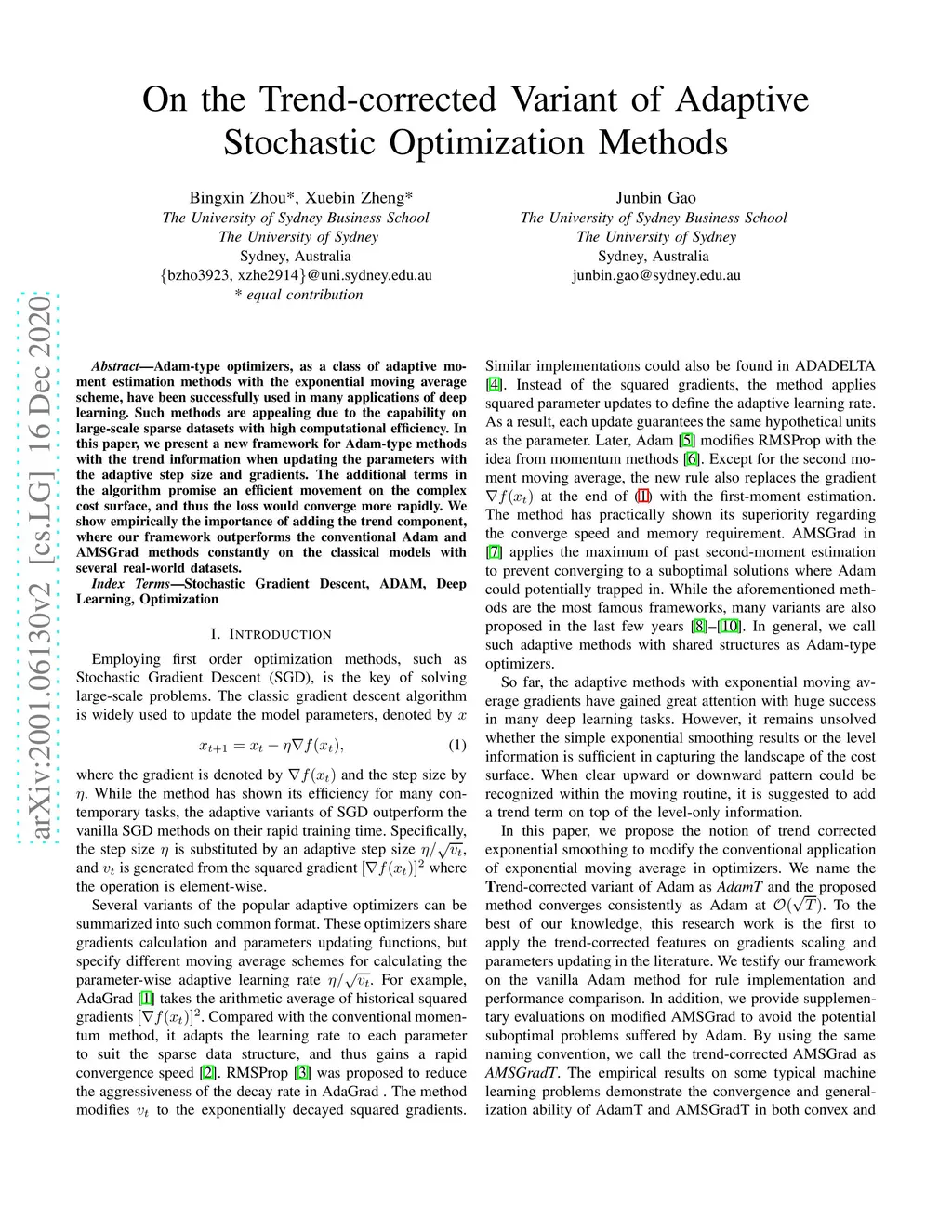 Adam-type optimizers, as a class of adaptive moment estimation methods with the exponential moving average scheme, have been successfully used in many applications of deep learning. Such methods are appealing for capability on large-scale sparse datasets with high computational efficiency. In this paper, we present a new framework for adapting Adam-type methods, namely AdamT. Instead of applying a simple exponential weighted average, AdamT also includes the trend information when updating the parameters with the adaptive step size and gradients. The additional terms promise an efficient movement on the complex cost surface, and thus the loss would converge more rapidly. We show empirically the importance of adding the trend component, where AdamT outperforms the vanilla Adam method constantly with state-of-the-art models on several classical real-world datasets.