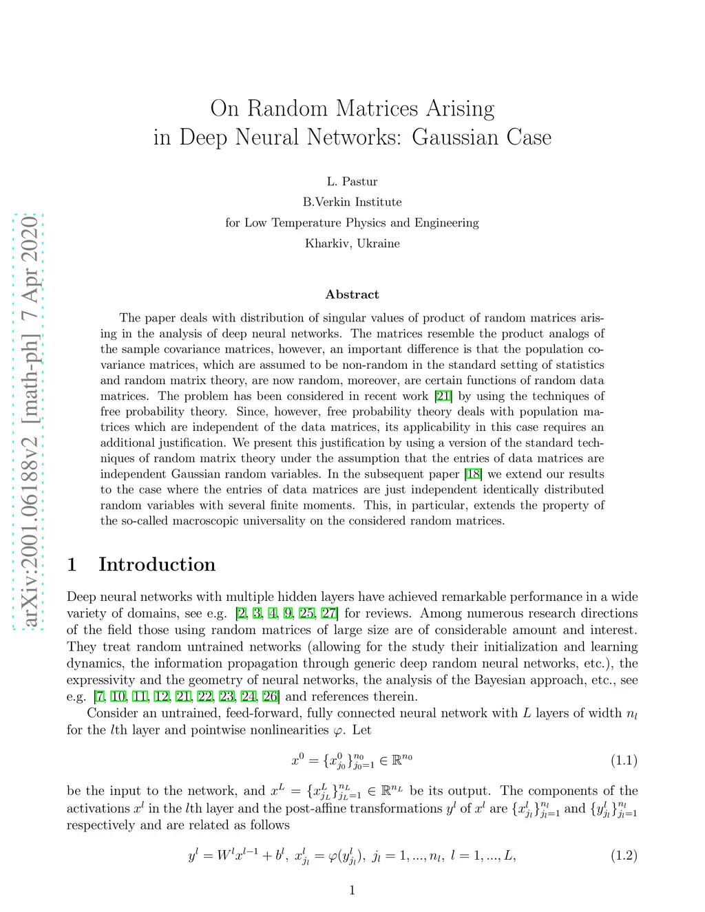 The paper deals with distribution of singular values of product of random matrices arising in the analysis of deep neural networks. The matrices resemble the product analogs of the sample covariance matrices, however, an important difference is that the population covariance matrices, which are assumed to be non-random in the standard setting of statistics and random matrix theory, are now random, moreover, are certain functions of random data matrices. The problem has been considered in recent work [21] by using the techniques of free probability theory. Since, however, free probability theory deals with population matrices which are independent of the data matrices, its applicability in this case requires an additional justification. We present this justification by using a version of the standard techniques of random matrix theory under the assumption that the entries of data matrices are independent Gaussian random variables. In the subsequent paper [18] we extend our results to the case where the entries of data matrices are just independent identically distributed random variables with several finite moments. This, in particular, extends the property of the so-called macroscopic universality on the considered random matrices.