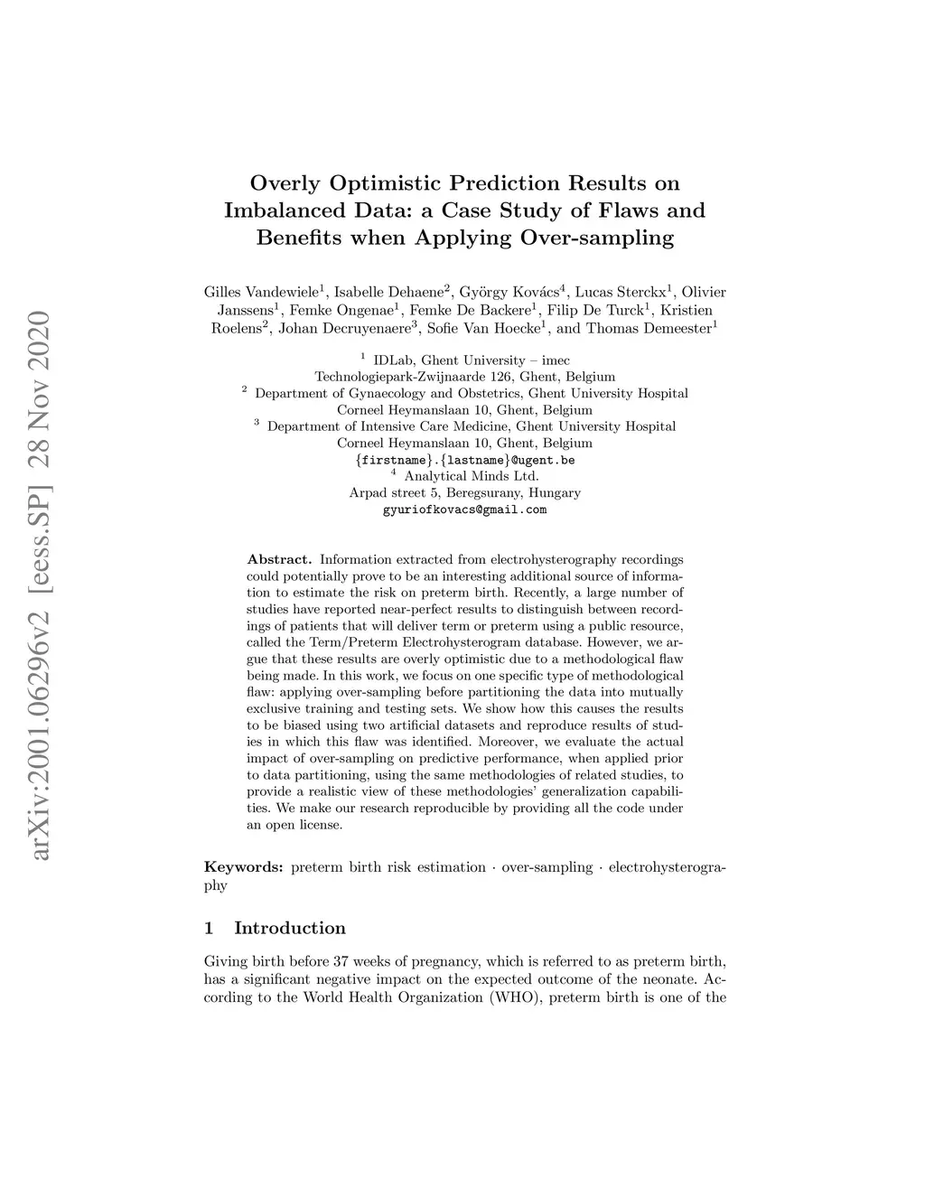 Information extracted from electrohysterography recordings could potentially prove to be an interesting additional source of information to estimate the risk on preterm birth. Recently, a large number of studies have reported near-perfect results to distinguish between recordings of patients that will deliver term or preterm using a public resource, called the Term/Preterm Electrohysterogram database. However, we argue that these results are overly optimistic due to a methodological flaw being made. In this work, we focus on one specific type of methodological flaw: applying over-sampling before partitioning the data into mutually exclusive training and testing sets. We show how this causes the results to be biased using two artificial datasets and reproduce results of studies in which this flaw was identified. Moreover, we evaluate the actual impact of over-sampling on predictive performance, when applied prior to data partitioning, using the same methodologies of related studies, to provide a realistic view of these methodologies' generalization capabilities. We make our research reproducible by providing all the code under an open license.