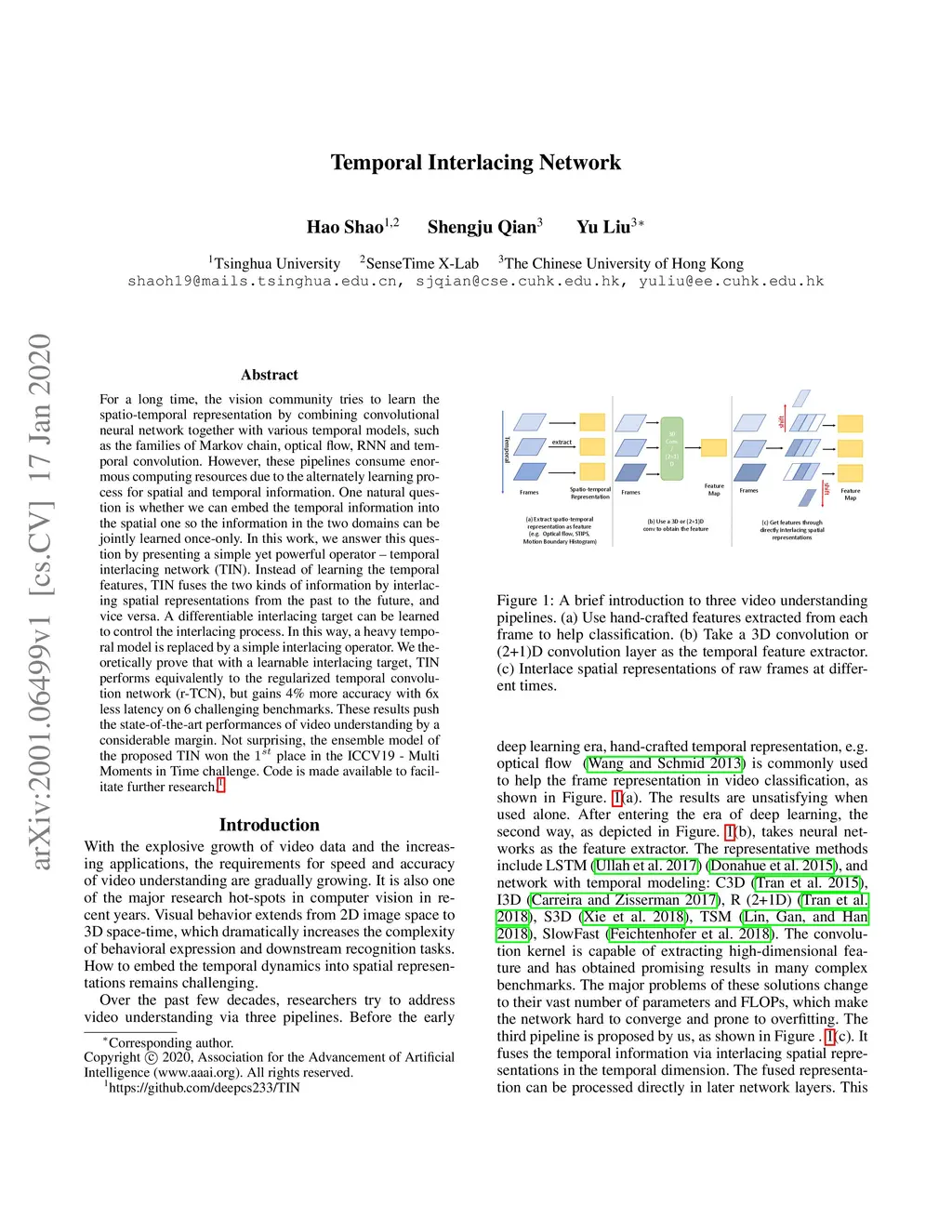 For a long time, the vision community tries to learn the spatio-temporal representation by combining convolutional neural network together with various temporal models, such as the families of Markov chain, optical flow, RNN and temporal convolution. However, these pipelines consume enormous computing resources due to the alternately learning process for spatial and temporal information. One natural question is whether we can embed the temporal information into the spatial one so the information in the two domains can be jointly learned once-only. In this work, we answer this question by presenting a simple yet powerful operator -- temporal interlacing network (TIN). Instead of learning the temporal features, TIN fuses the two kinds of information by interlacing spatial representations from the past to the future, and vice versa. A differentiable interlacing target can be learned to control the interlacing process. In this way, a heavy temporal model is replaced by a simple interlacing operator. We theoretically prove that with a learnable interlacing target, TIN performs equivalently to the regularized temporal convolution network (r-TCN), but gains 4% more accuracy with 6x less latency on 6 challenging benchmarks. These results push the state-of-the-art performances of video understanding by a considerable margin. Not surprising, the ensemble model of the proposed TIN won the place in the ICCV19 - Multi Moments in Time challenge. Code is made available to facilitate further research at https://github.com/deepcs233/TIN