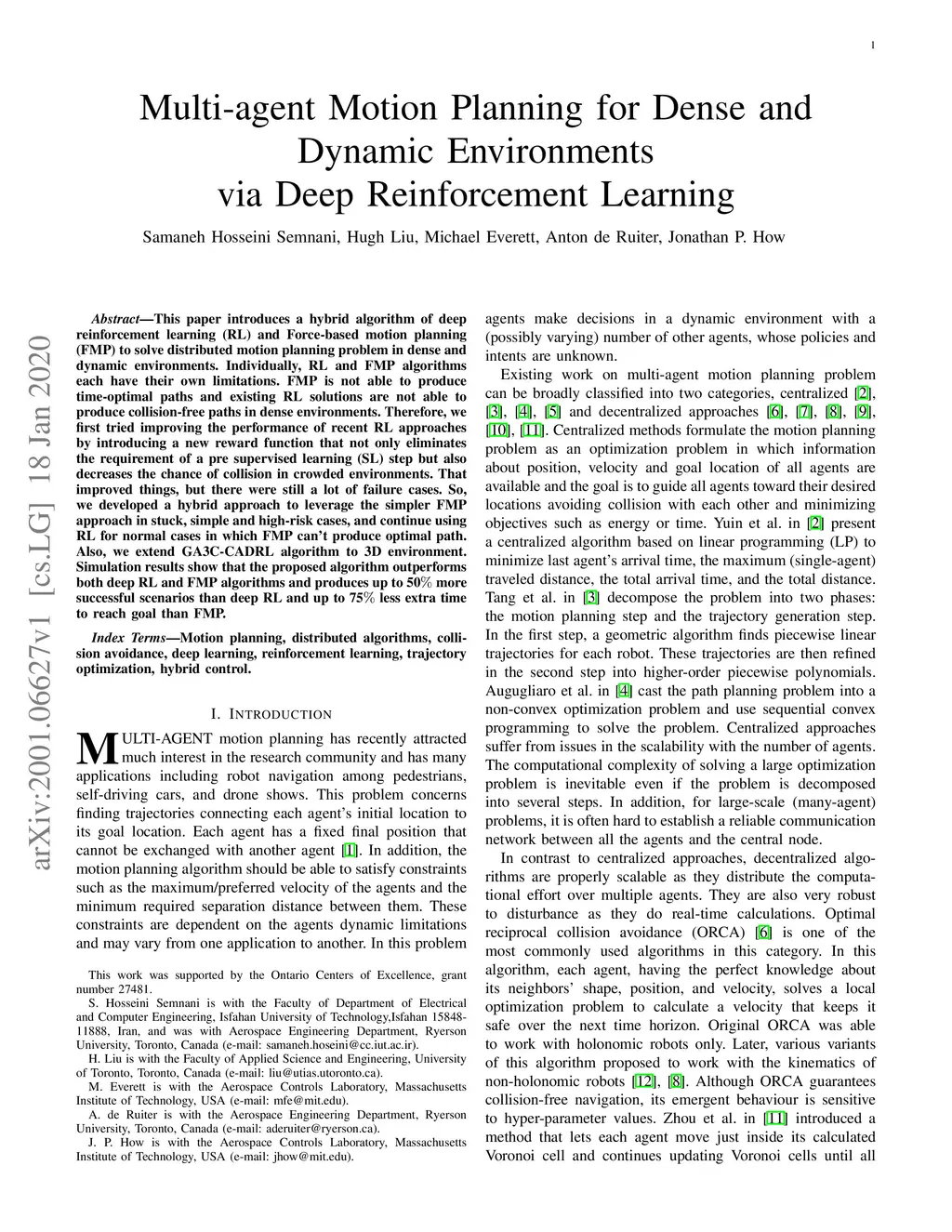 This paper introduces a hybrid algorithm of deep reinforcement learning (RL) and Force-based motion planning (FMP) to solve distributed motion planning problem in dense and dynamic environments. Individually, RL and FMP algorithms each have their own limitations. FMP is not able to produce time-optimal paths and existing RL solutions are not able to produce collision-free paths in dense environments. Therefore, we first tried improving the performance of recent RL approaches by introducing a new reward function that not only eliminates the requirement of a pre supervised learning (SL) step but also decreases the chance of collision in crowded environments. That improved things, but there were still a lot of failure cases. So, we developed a hybrid approach to leverage the simpler FMP approach in stuck, simple and high-risk cases, and continue using RL for normal cases in which FMP can't produce optimal path. Also, we extend GA3C-CADRL algorithm to 3D environment. Simulation results show that the proposed algorithm outperforms both deep RL and FMP algorithms and produces up to 50% more successful scenarios than deep RL and up to 75% less extra time to reach goal than FMP.