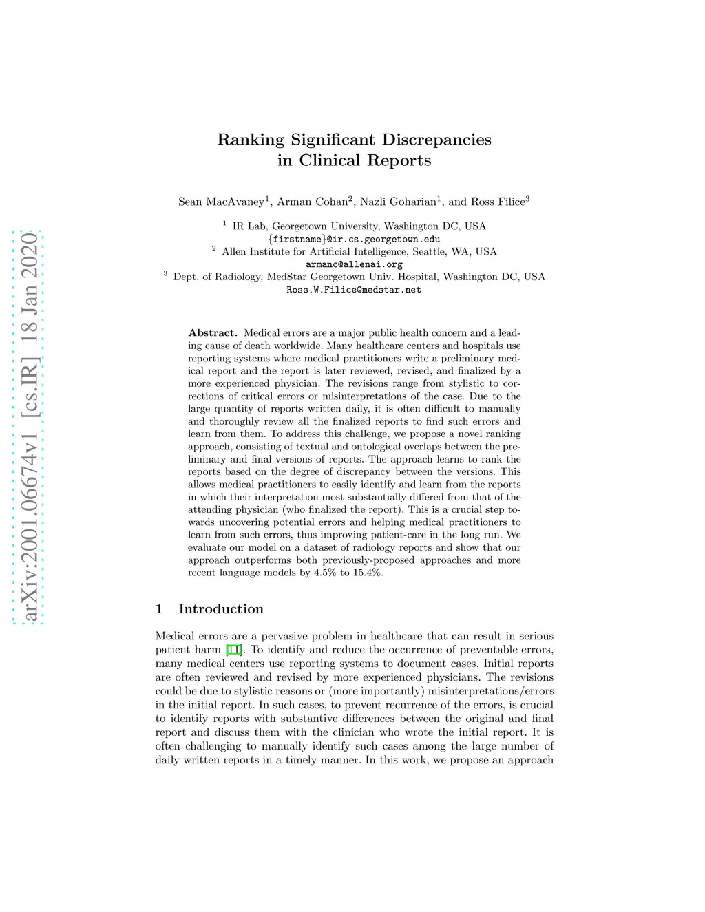 Medical errors are a major public health concern and a leading cause of death worldwide. Many healthcare centers and hospitals use reporting systems where medical practitioners write a preliminary medical report and the report is later reviewed, revised, and finalized by a more experienced physician. The revisions range from stylistic to corrections of critical errors or misinterpretations of the case. Due to the large quantity of reports written daily, it is often difficult to manually and thoroughly review all the finalized reports to find such errors and learn from them. To address this challenge, we propose a novel ranking approach, consisting of textual and ontological overlaps between the preliminary and final versions of reports. The approach learns to rank the reports based on the degree of discrepancy between the versions. This allows medical practitioners to easily identify and learn from the reports in which their interpretation most substantially differed from that of the attending physician (who finalized the report). This is a crucial step towards uncovering potential errors and helping medical practitioners to learn from such errors, thus improving patient-care in the long run. We evaluate our model on a dataset of radiology reports and show that our approach outperforms both previously-proposed approaches and more recent language models by 4.5% to 15.4%.
